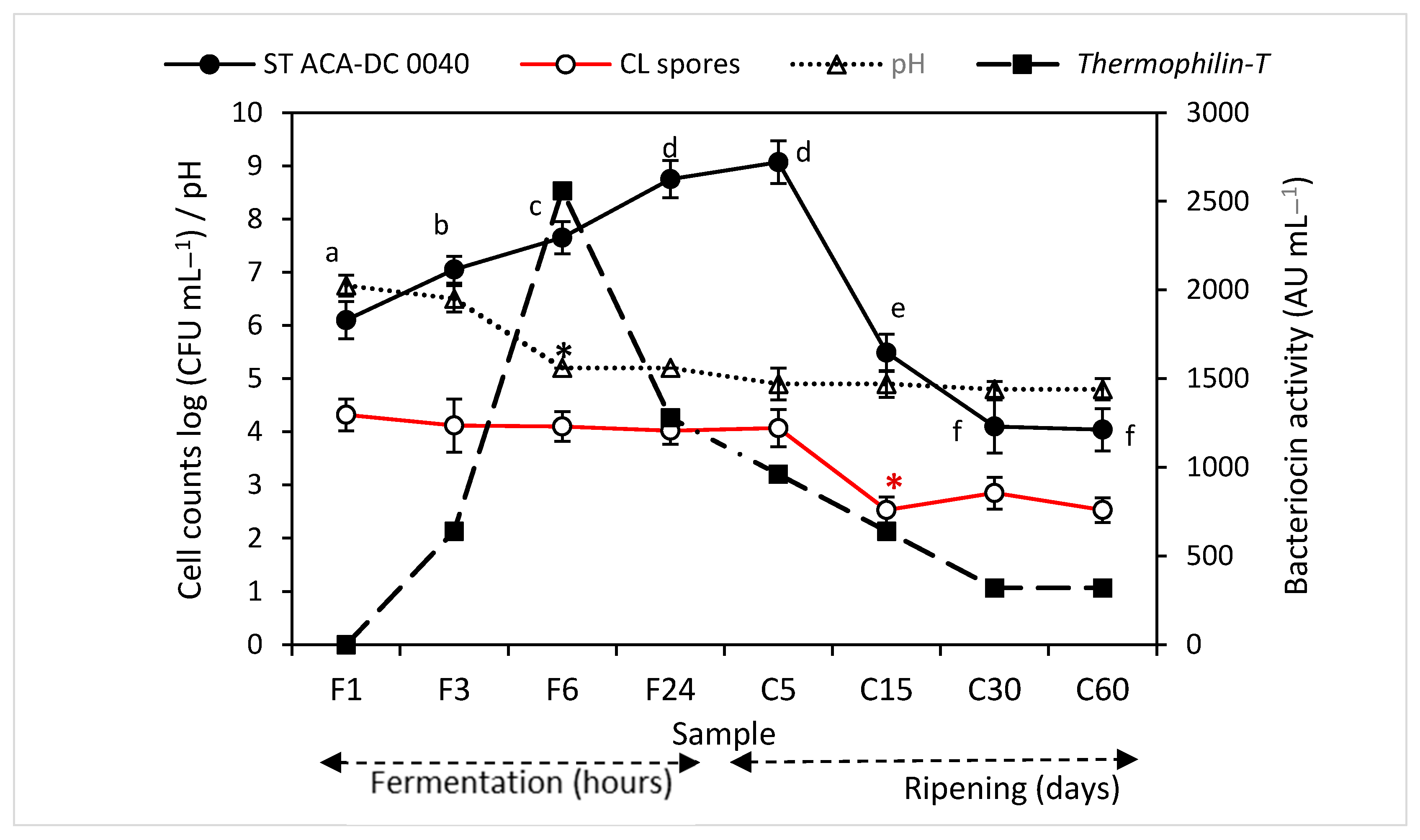 - Mathot, A.G.; Beliard, E.; Thuault, D. Streptococcus thermophilus 580 Produces a Bacteriocin Potentially Suitable for Inhibition of Clostridium tyrobutyricum in Hard Cheese. J. Dairy Sci. 2003, 86, 3068–3074. [Google Scholar] [CrossRef] [PubMed]