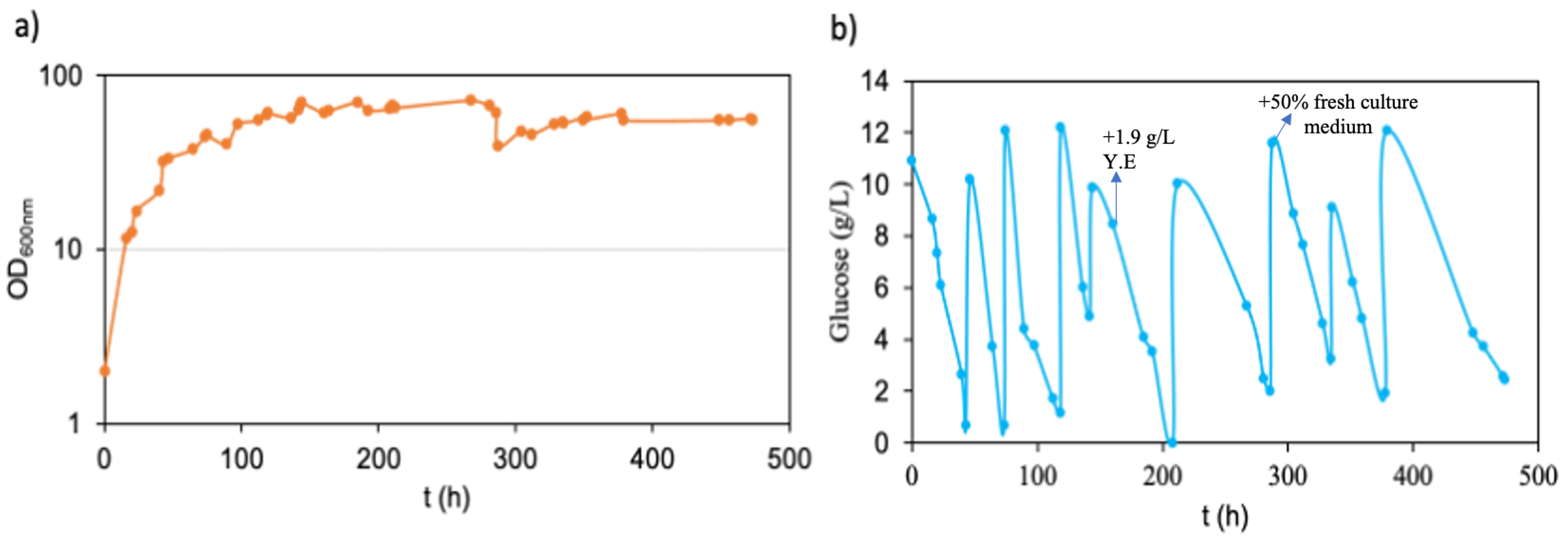 600nm = 71.9, after having consumed 52.56 g/L glucose. Overall, a total of 81.1 g/L glucose had been consumed at the end of the last substrate addition, when stopping the experiment.