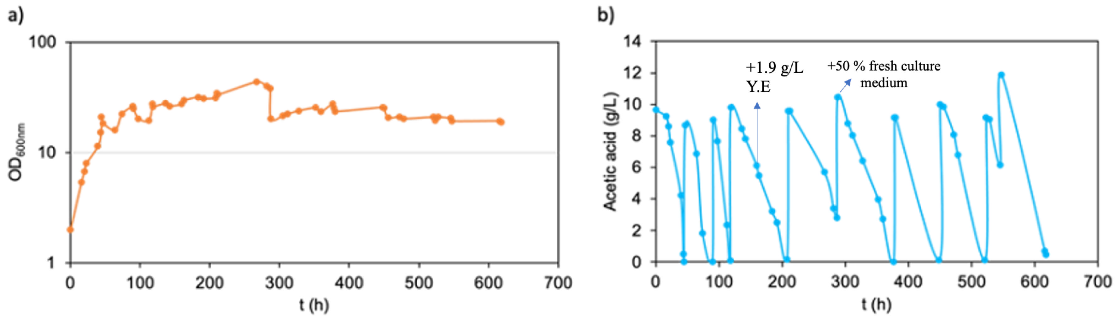600nm = 43.5, after having consumed 40.7 g/L acetic acid. A total of 87.4 g/L acetic acid had been consumed at the end of the last substrate addition.