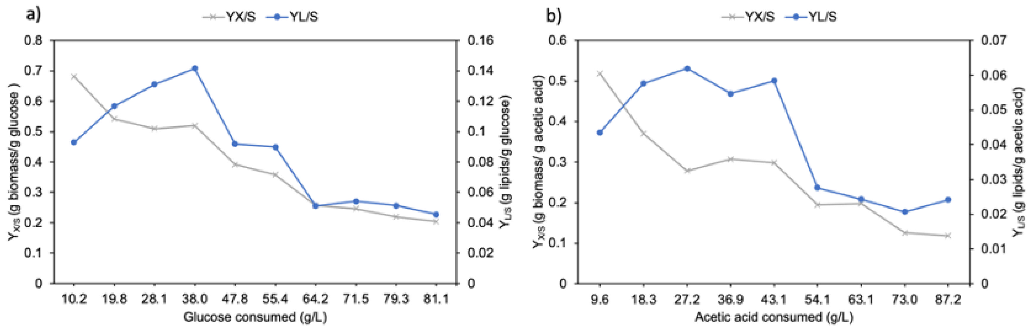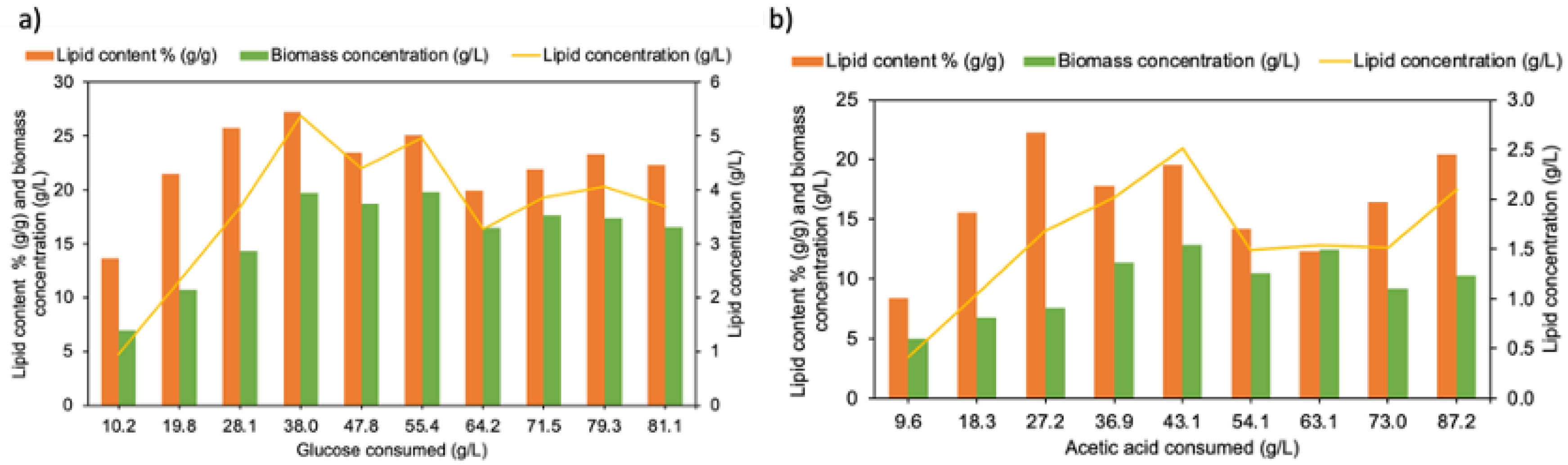 Figure 4b). While the biomass yield decreases with increasing amounts of substrate consumed, substrate consumption has a favorable effect on the lipid yield up to a certain point; maximum lipid yields of 0.14 g/g glucose and 0.06 g/g acetic acid were reached for 38 g/L and 27.2 g/L substrate consumed in each case. Generally, the highest yields for both biomass and lipids are achieved with glucose. These results sound promising, as they indicate that after the yeast’s initial growth, substrate consumption is directed more towards lipid production rather than cell growth. Regarding the lipid yields obtained with acetic acid, the maximum Y