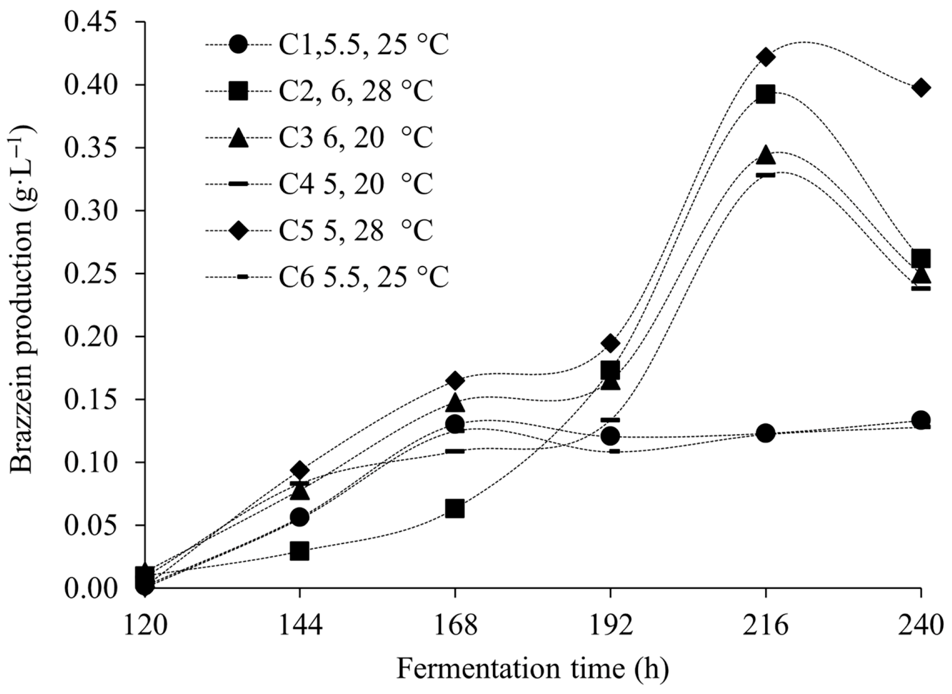 −1. At this point, pH 5.5 at 25 °C (C1) reached the highest values (75–77 g·L