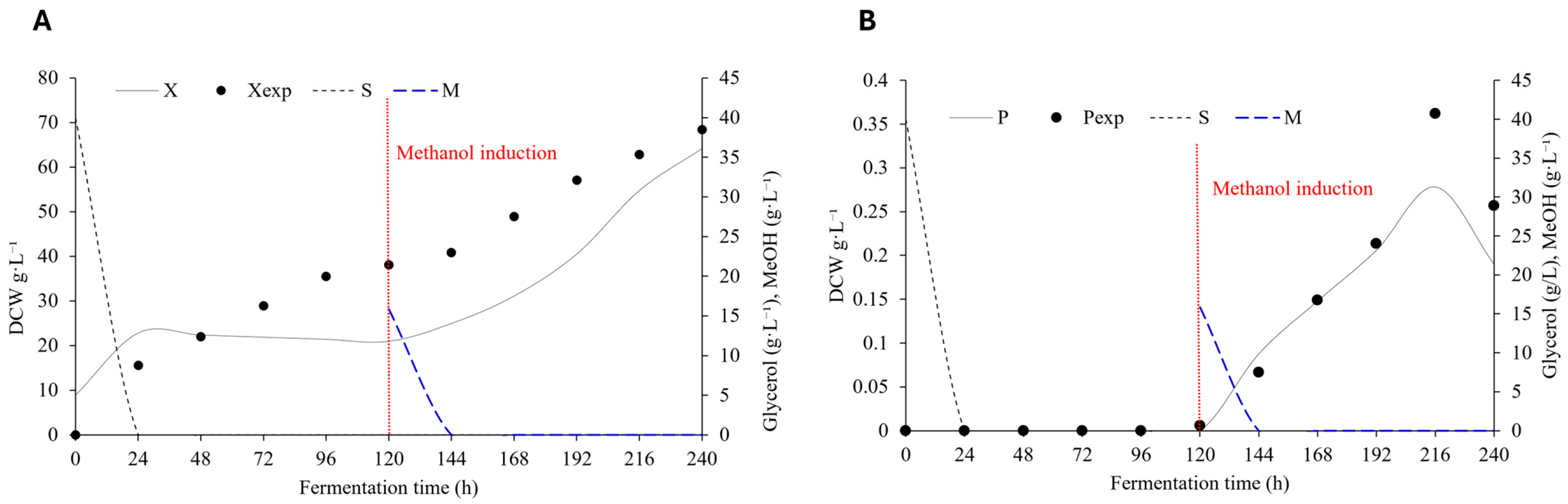 Figure 5A, the simulated biomass profile (solid gray line) models the experimental dry cell weight measurements (black dots), capturing both the initial adaptation phase and the progressive biomass accumulation during methanol induction. The model also accurately describes glycerol depletion (dotted line), which decreases sharply during the first 24 h, consistent with its rapid consumption during the growth phase. Similarly, the simulated methanol profile (blue dashed line) aligns with the expected induction dynamics, reflecting its metabolic utilization after the shift to methanol feeding as well as the onset of recombinant protein production. In