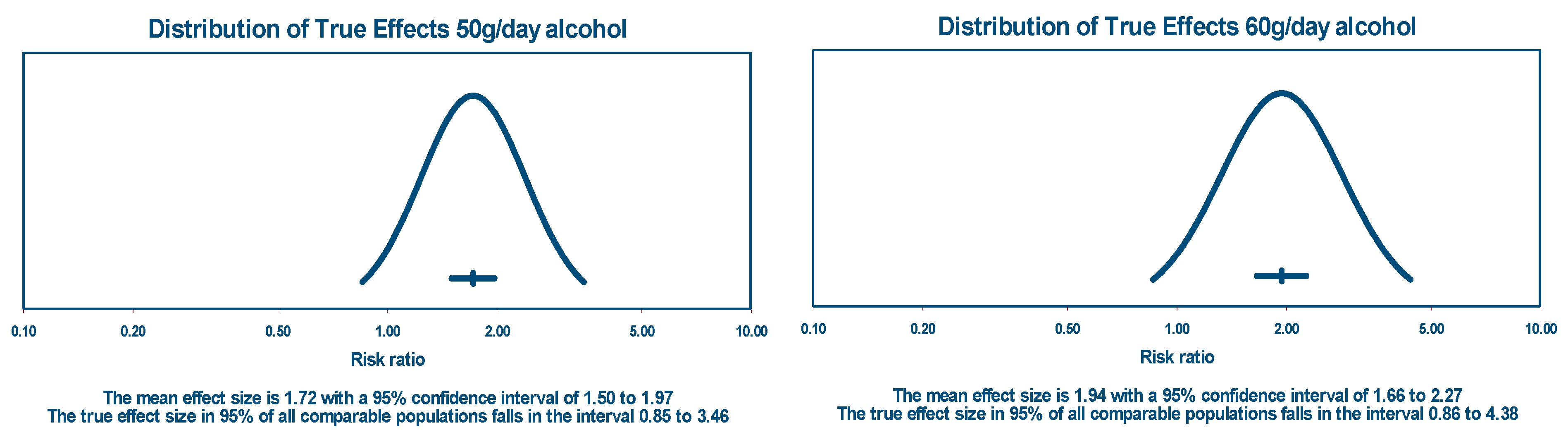 - Large effects are obtained (relative risks 3–20) compared to small effects (relative risks 1.1–1.5);