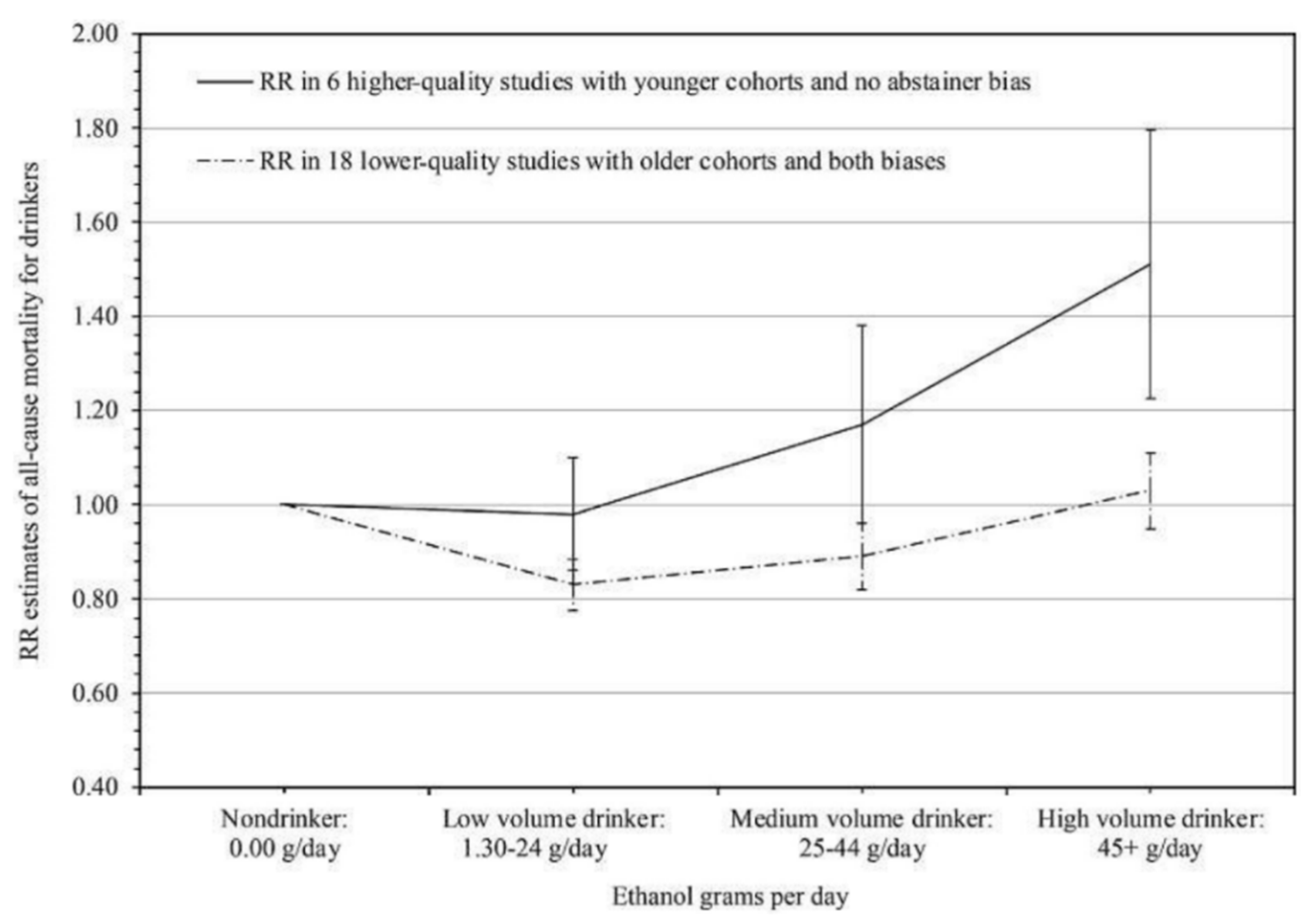 - Stockwell, T.; Zhao, J.; Clay, J.; Levesque, C.; Sanger, N.; Sherk, A.; Naimi, T. Why Do Only Some Cohort Studies Find Health Benefits From Low-Volume Alcohol Use? A Systematic Review and Meta-Analysis of Study Characteristics That May Bias Mortality Risk Estimates. J. Stud. Alcohol Drugs 2024, 85, 441–452. [Google Scholar] [CrossRef]