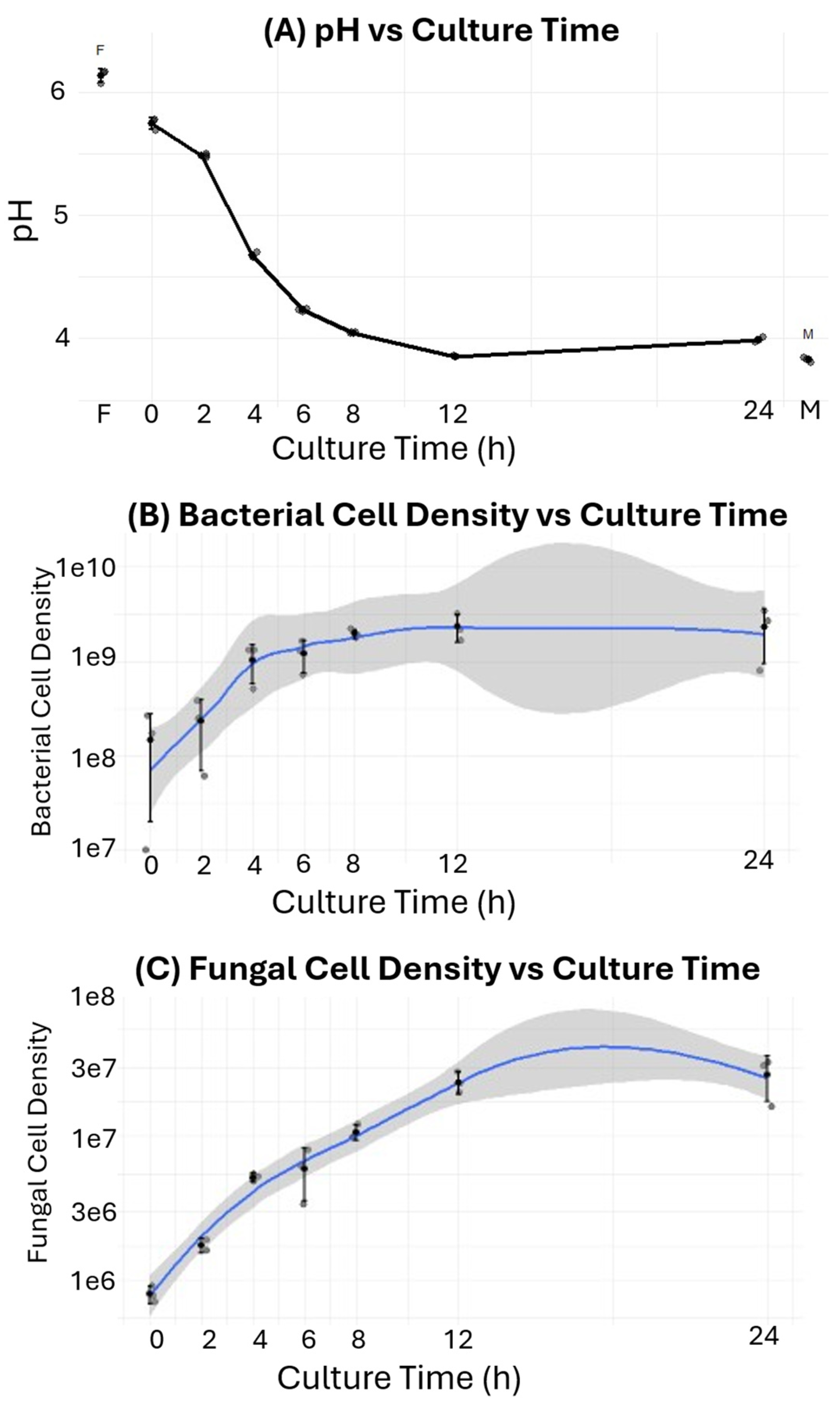 Figure 1A) from 6.2 to 5.7 at time = 0 is due to the mixture of the mature leaven at a pH of 3.85 (see below) in the mass proportion of 1:20 with flour. Subsequently, the pH decreases more slowly during the culture’s first 2 h and more rapidly over the next 10 h due to the growth of lactic acid bacteria (