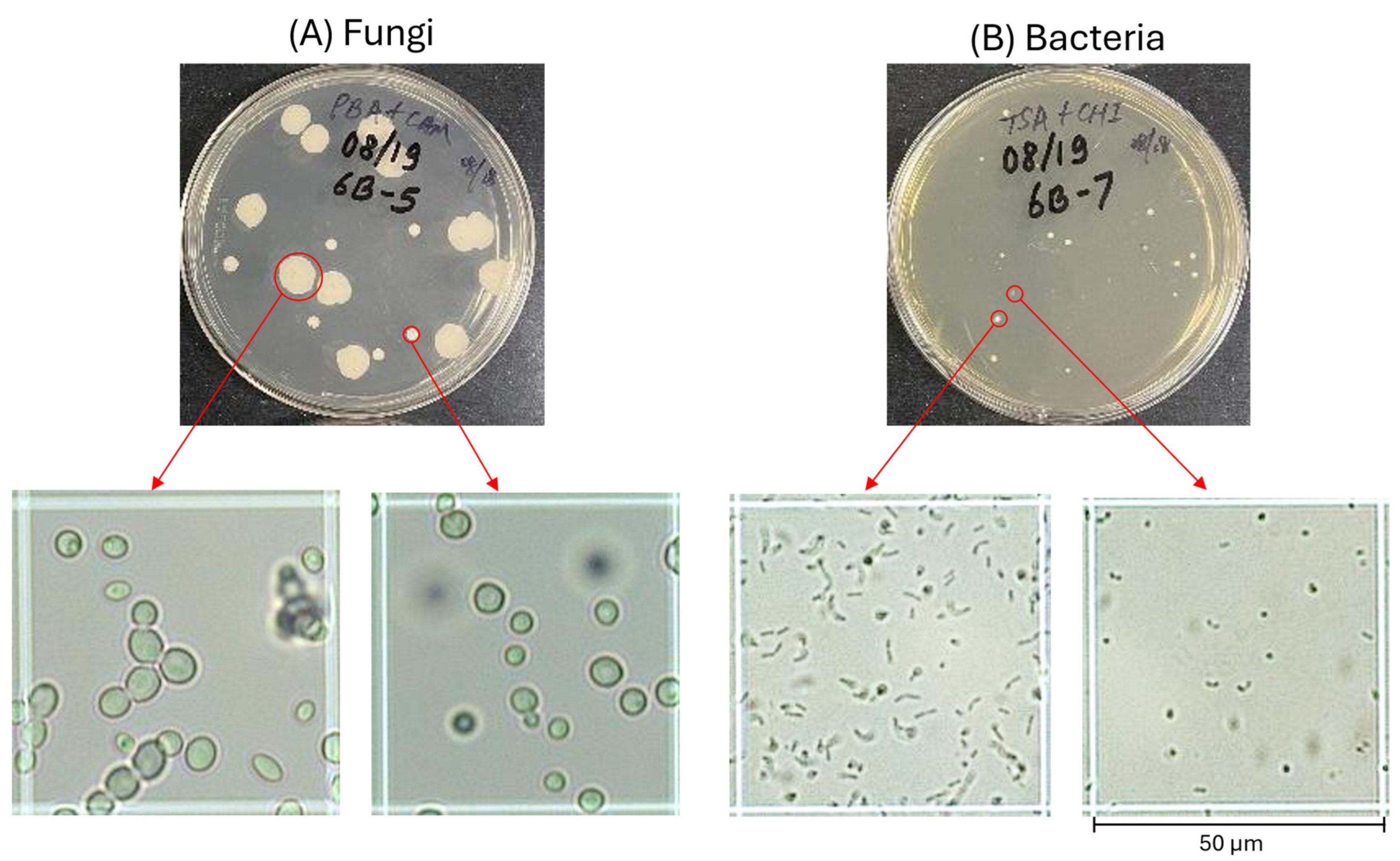 Colonies were used for wet mount microscopy and DNA extraction for PCR and Sanger sequencing. The colonies were sampled with a sterile micropipette tip and resuspended in 20 μL sterile saline for wet mount microscopy. The saline suspensions were loaded on a hemocytometer slide to provide scale markings. The best micrographs, taken at 400× for the fungi and 1000× with oil immersion for the bacteria, were obtained from colonies with actively dividing cells, after 1–3 days of incubation.