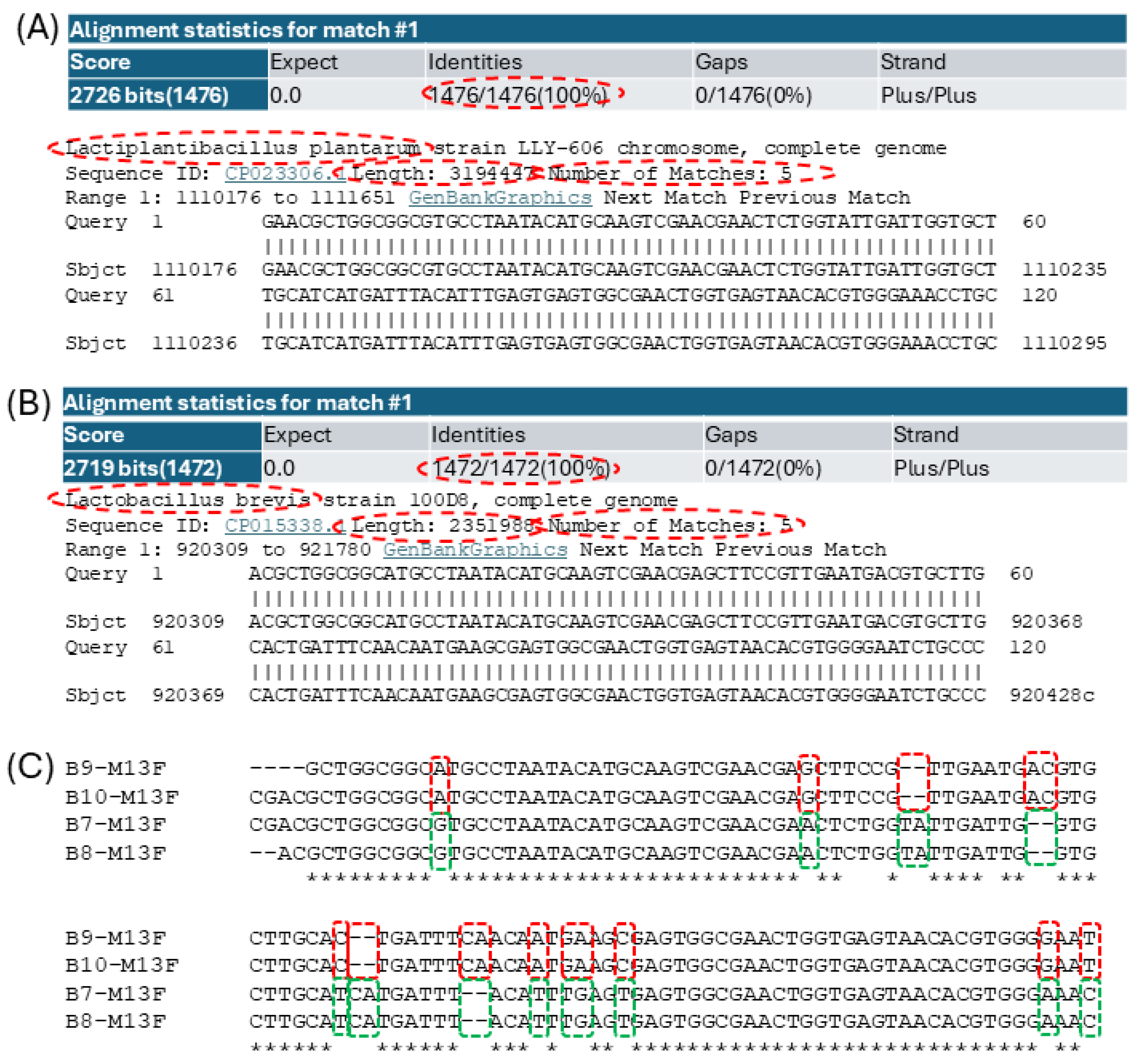 Table 1 for primer sequences. The amplifications were performed with 35 cycles of 94 °C and 30’, 55 °C and 30’, and 72 °C and 2’, including an initial denaturation and a final extension step preceding and following the cycles. Following this, 2 μL of each PCR sample was electrophoresed on an agarose gel; those that amplified well were sent for Sanger sequencing using M13 forward and reverse primers (Azenta, South Plainfield, NJ, USA). The forward and reverse 16S bacterial sequences were assembled to ~1450 bp full-length amplicons. The amplicon sequences were assigned to genera using NCBI BLASTn (
