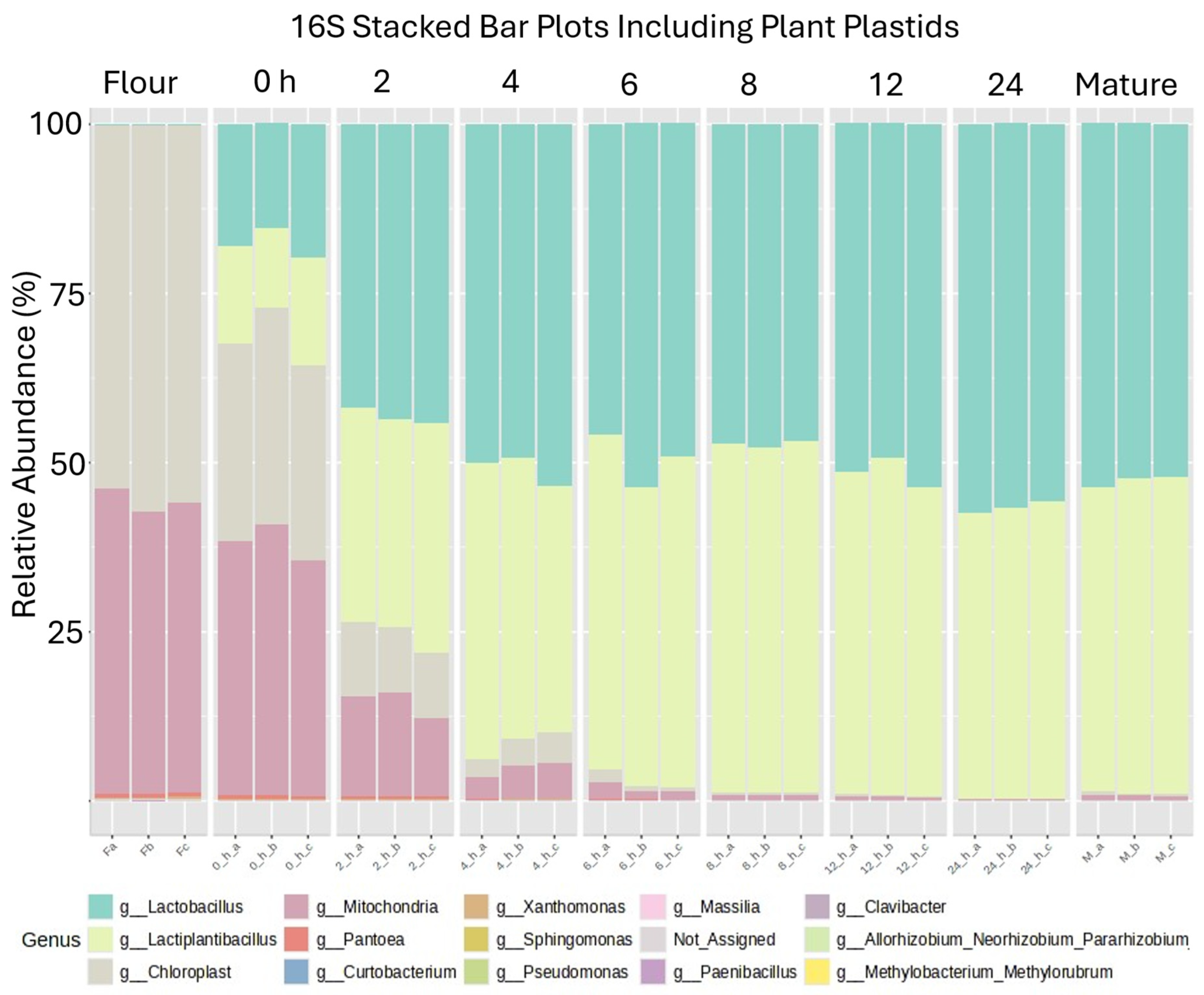 Figure 9) to visualize the rapid replacement of bacteria endogenous to flour by the LAB. Fifteen bacterial genera were identified in the flour with the exclusion of plant plastids (legend at the bottom of