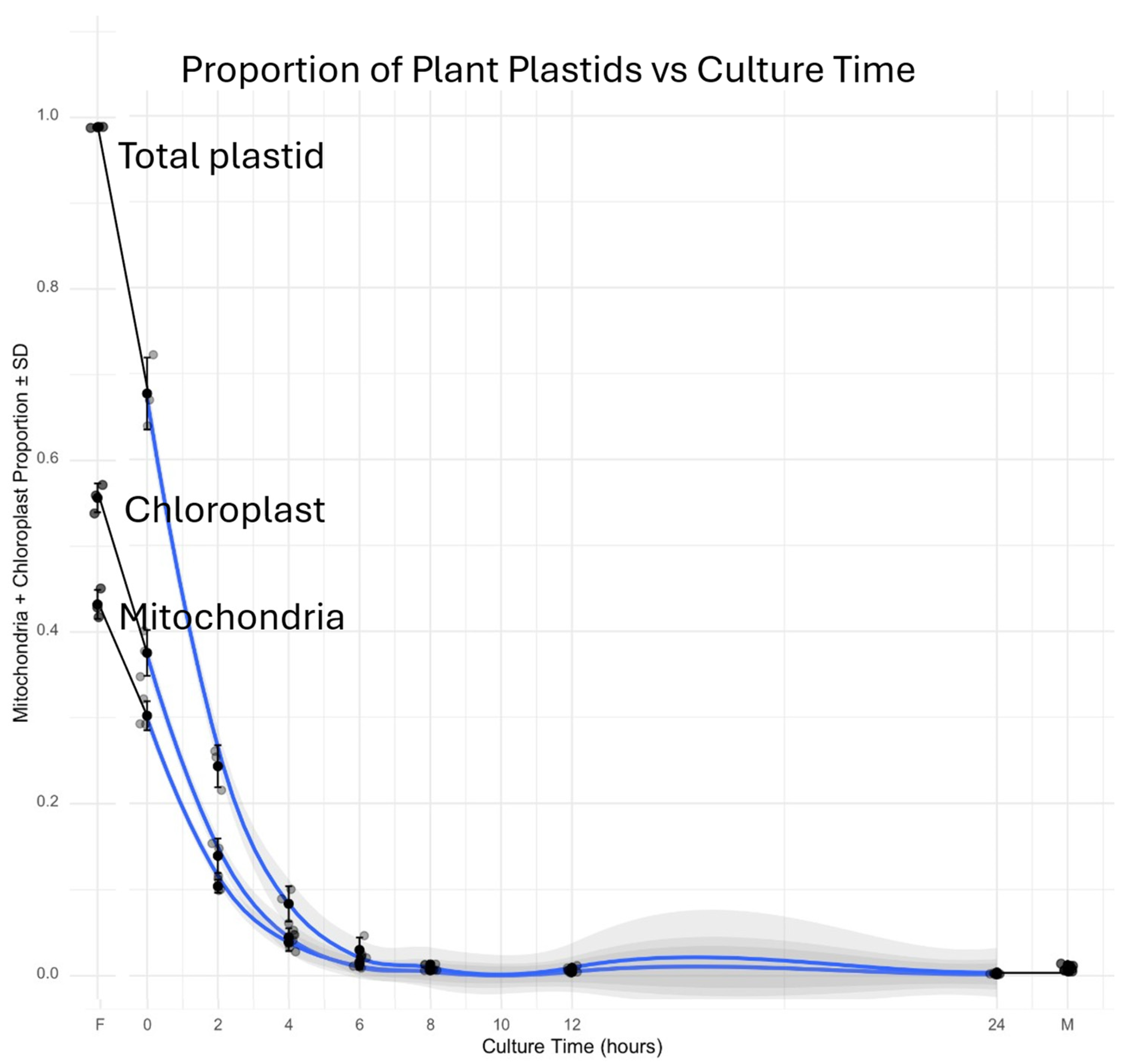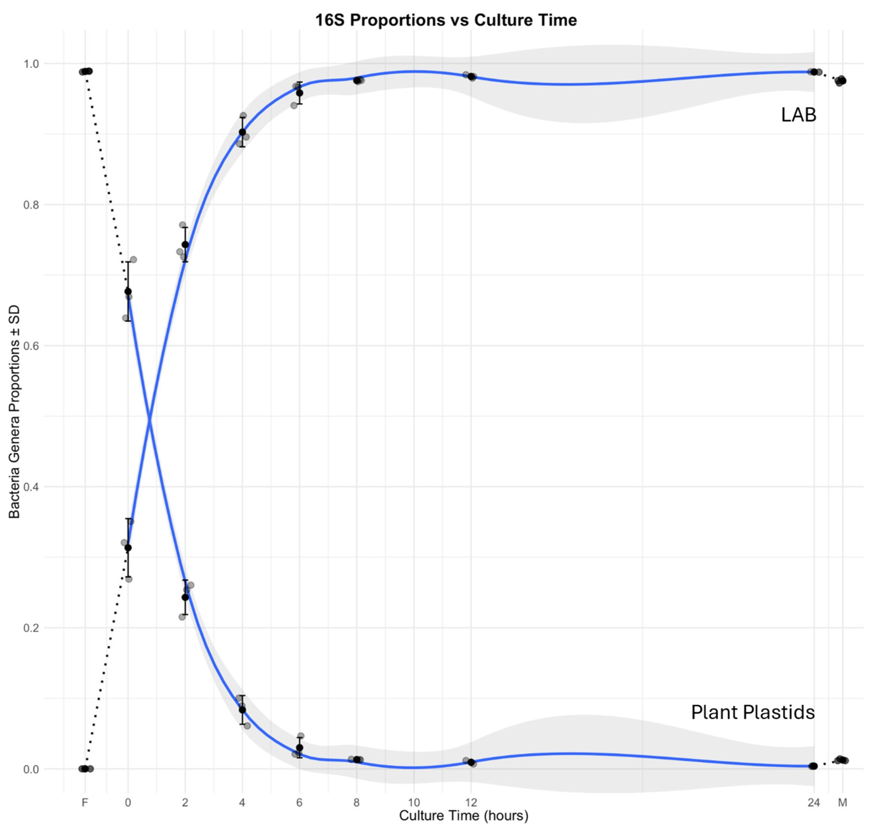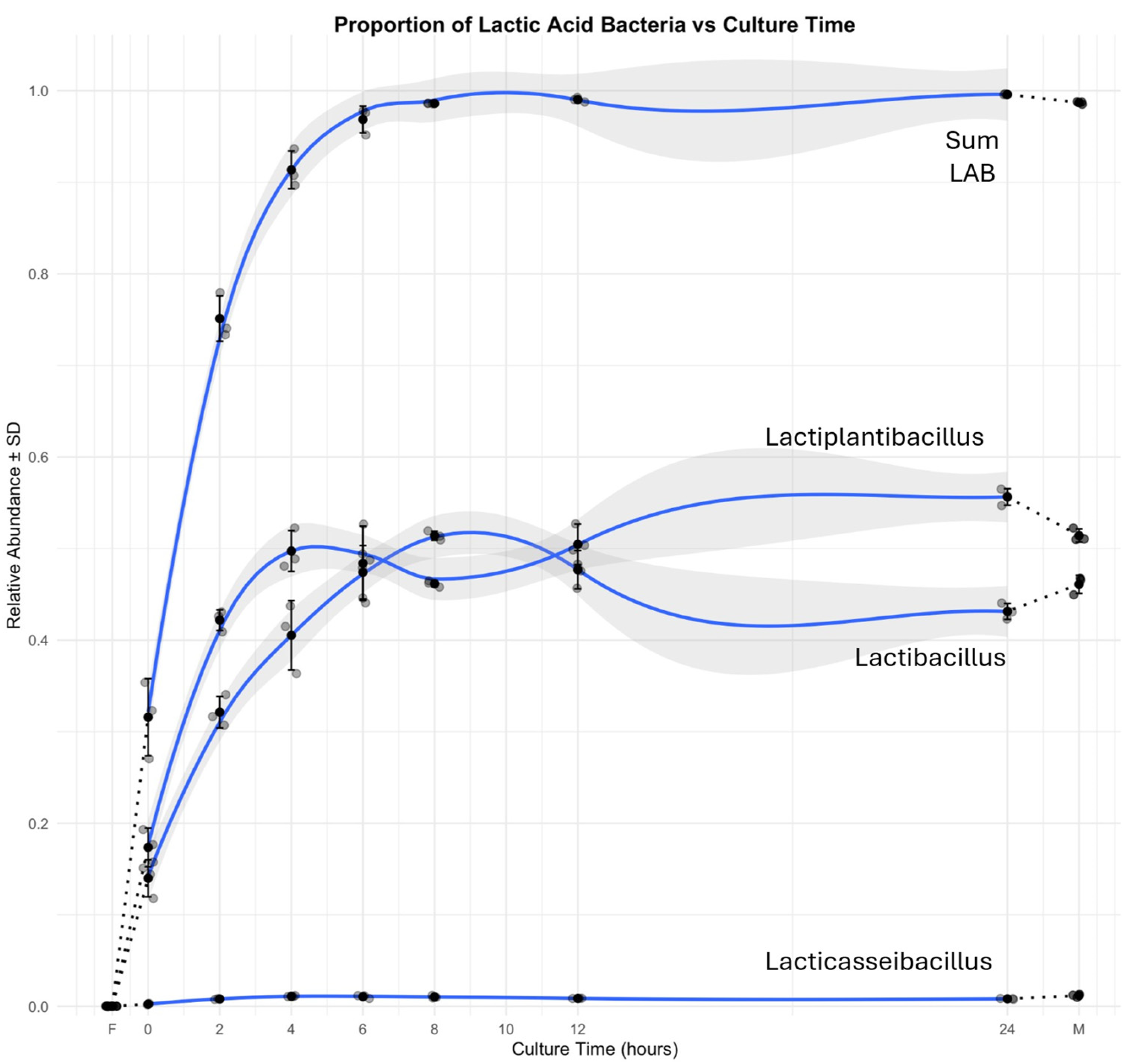 Feeding and sampling over a 24 h time course. The fresh mature flour leaven was brought to the research lab, and 2 g was placed in a sterile 50 mL Falcon tube. Sterile deionized water was added to the 20 g and mixed with a sterile spatula. To create a total of 40 g, 20 g of a white/rye flour mixture was added and mixed to uniformity. Approximately 1 g of this mixture was dispensed into each of the 21 sterile 15 mL Falcon tubes, which is sufficient for seven triplicate samples, and was incubated at 27 °C. The triplicate samples of flour mixture (F) and the mature culture used for feeding (M) were also included. As presented, the samples are F, 0 h, 2 h, 4 h, 6 h, 8 h, 12 h, 24 h, and M.