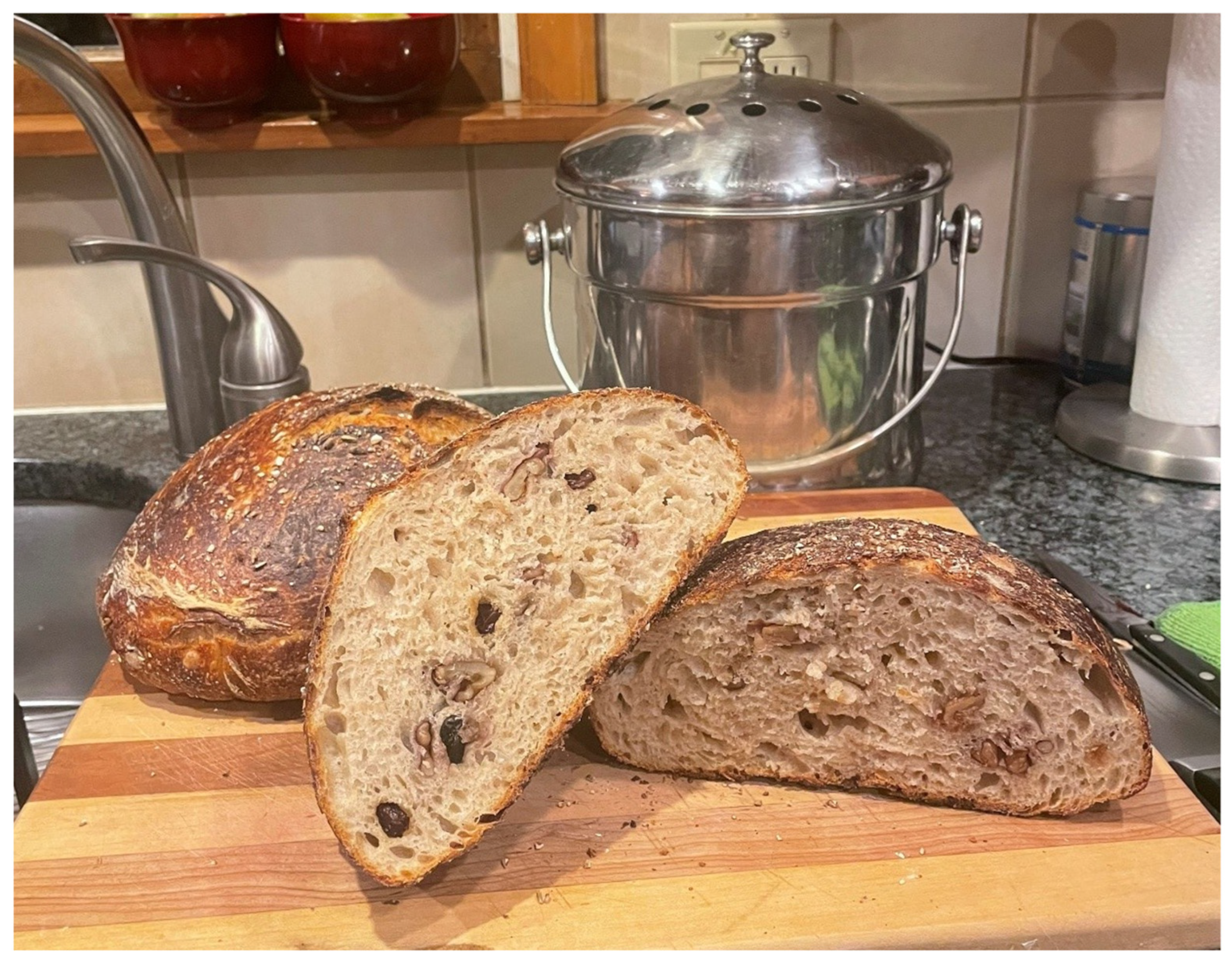 Figure 13. Walnuts and black raisins were added to the dough in the last fold before proofing.
