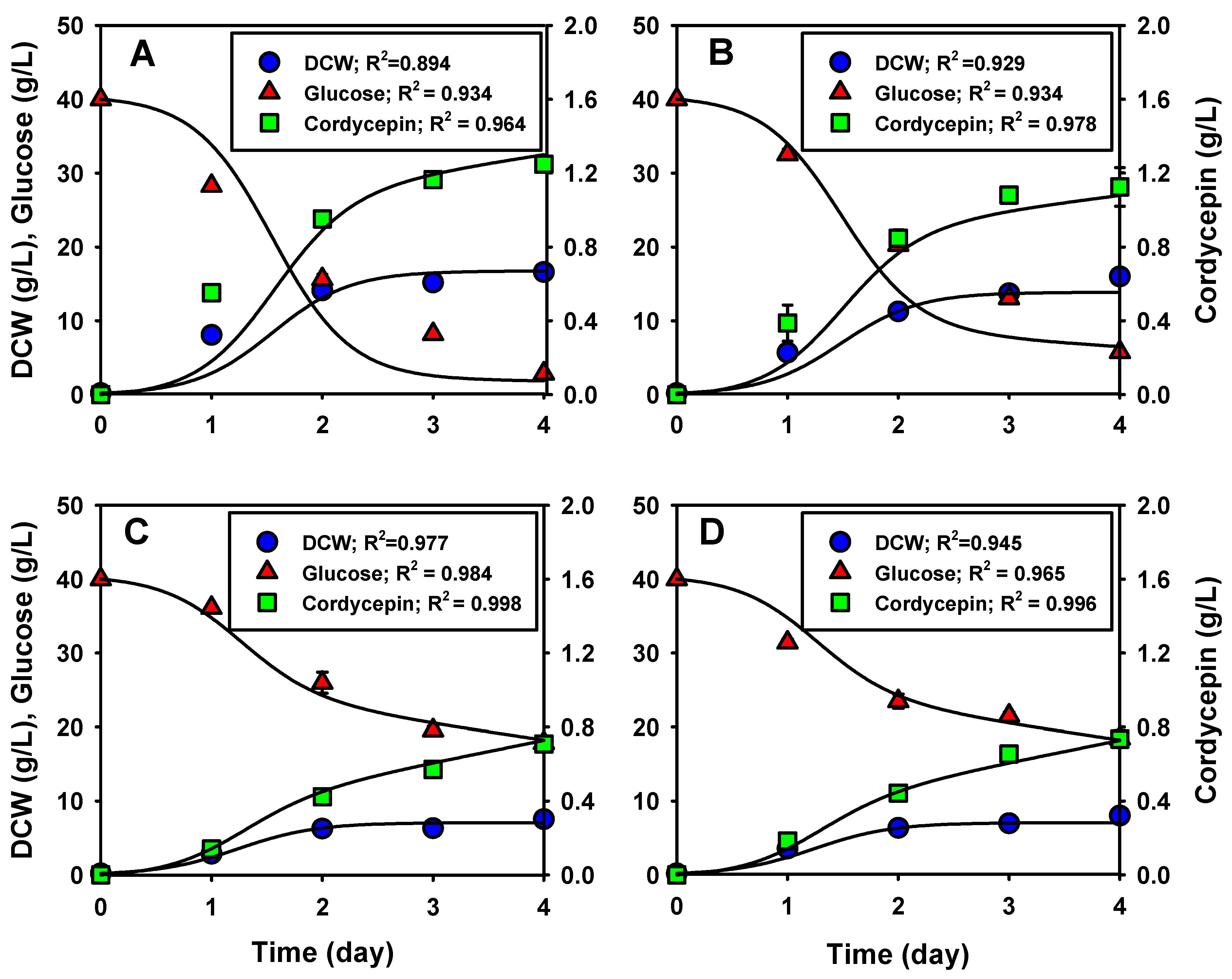 2.6. Kinetic Modeling of Mycelial Growth and Cordycepin Production