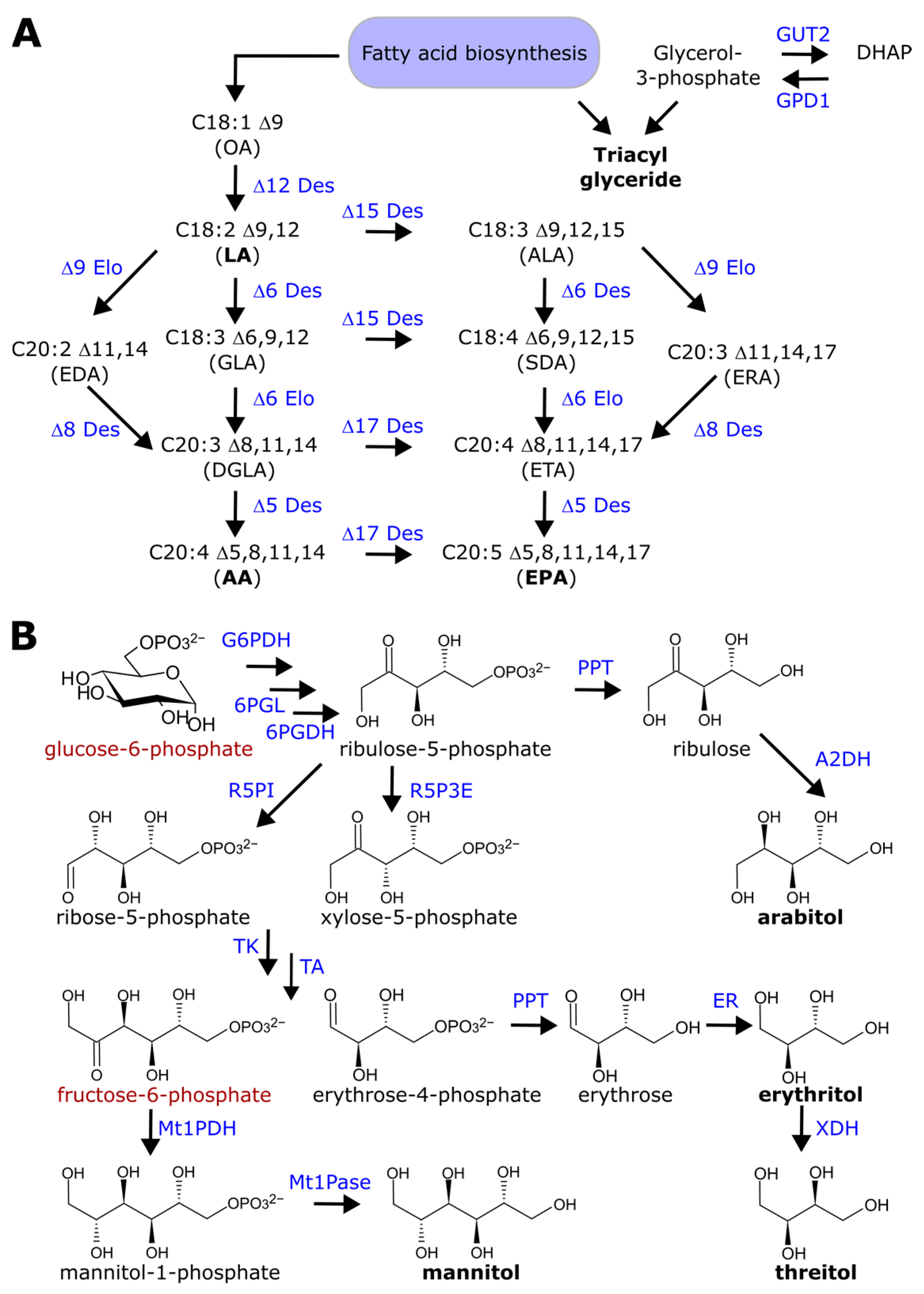 - Wasylenko, T.M.; Ahn, W.S.; Stephanopoulos, G. The oxidative pentose phosphate pathway is the primary source of NADPH for lipid overproduction from glucose in Yarrowia lipolytica. Metab. Eng. 2015, 30, 27–39. [Google Scholar] [CrossRef]