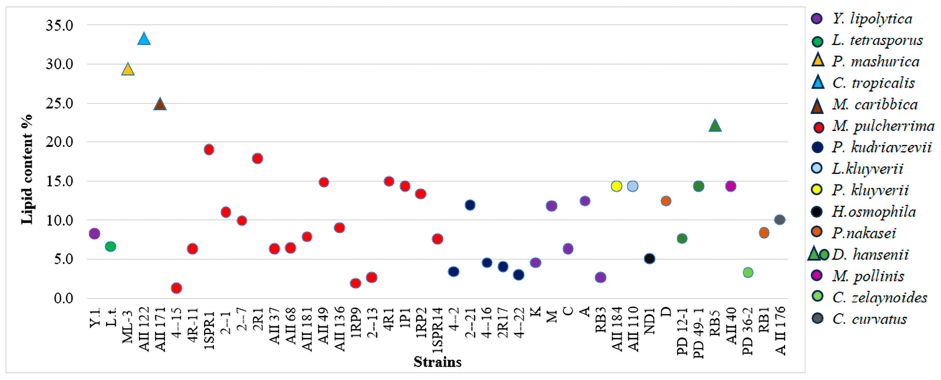 - Group 2, composed of strains containing oil droplets in all the cells. These strains were the following: 1P1, 1RP2, 1SPR1, 1SPR14, 2-1, 2-7, 2R1, 4R1, AII 37, AII 68, AII 136, AII 181, AII 49 (M. pulcherrima); M, C, A, RB3 (Y. lipolytica); PD 36-2 (C. zeylanoides); AII 122 (C. tropicalis; RB5, PD 12-1, PD 49-1 (D. hansenii); ND1 (H. osmophila); AII184 (L. kluyveri); AII 40 (Mon. pollinis); AII171 (Mey. caribbica); 2-21, 4-16, 2R-17 (P. kudriavzevii); AII110 (P. kluyveri); ML-3 (P. manshurica); and D (P. nakasei). As expected, the control strains (L. tetrasporus and Y. lipolytica) showed a high intracellular lipid accumulation ability. The strains included in group 2 can be considered as potential lipid producers.
