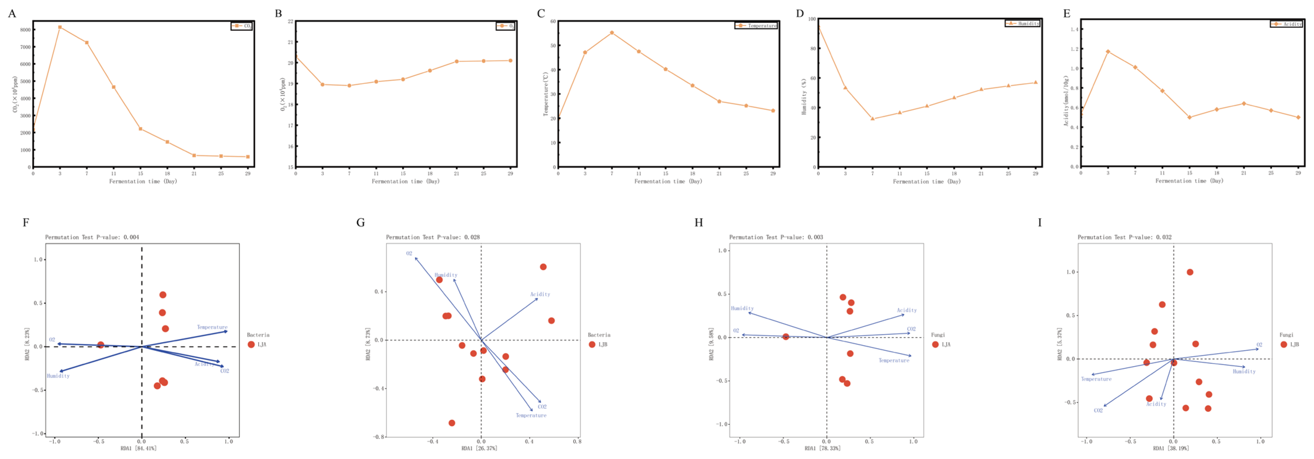 Chicago/Turabian StyleWang, Dongmei, Fei Wang, Ping Tang, Lei Wang, Yusheng Xie, Maosen Xiong, Qian Luo, Yanping Luo, Dan Huang, and Lei Yang. 2026. "Deterministic Drivers of Microbial Community Succession in Nongxiang Daqu Fermentation: Fungi Exhibit Stronger Environmental Selection Imprints than Bacteria" Fermentation 12, no. 4: 193. https://doi.org/10.3390/fermentation12040193