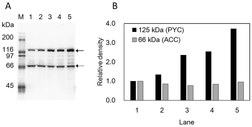 Analysis of biotinylated proteins by using streptavidin-alkaline phosphatase conjugate. Cell-free extracts (2 μg-proteinper lane) from CRZ1 (lane 1), CRZ19 (lane 2), CRZ20 (lane 3), CRZ21 (lane 4), and CRZ1-pCRA717 (lane 5) strains were separated by SDS-PAGE on 12% gel (A). MW 125 kDa (solid arrow) and 66 kDa (dotted arrow) were estimated in reference to the protein marker (M). (B) shows relative densities of the 125 kDa (black) and 66 kDa bands (gray) in panel A. Density of each band (PYC or ACC) in lanes 2 to 5 was compared with the corresponding band in lane 1 by using the ImageJ software.
