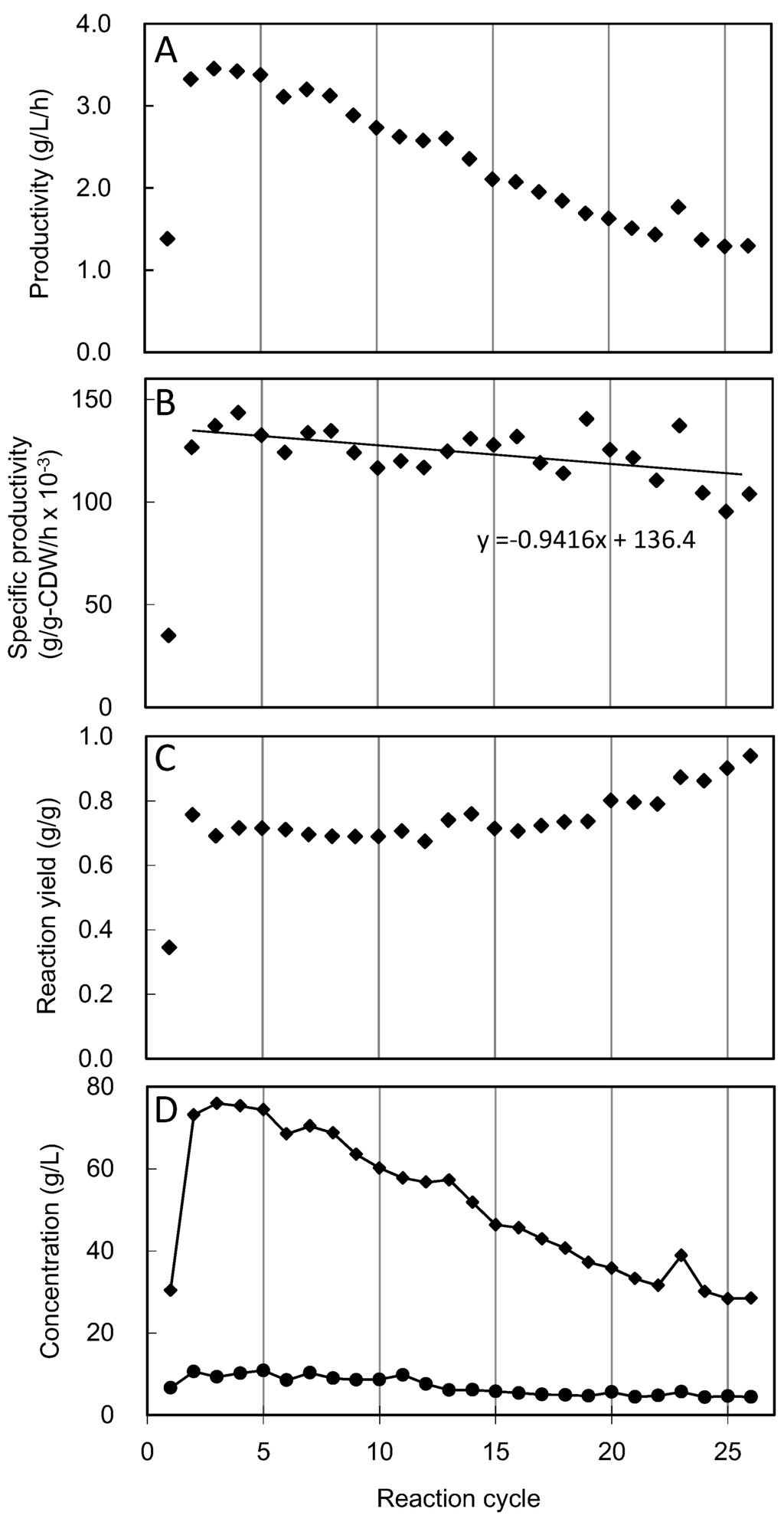 Cell recycle fed-batch reaction using CRZ21 strain of C. glutamicum under conditions of oxygen deprivation. Diamonds indicate volumetric productivity (A), specific productivity (B), reaction yield (C) and concentrations of succinic acid and acetic acid (D) in each reaction. The reaction yield is defined as the amount of SA produced (g)/amount of glucose consumed (g), during a single reaction. Regression line in panel B was fitted to the data from the 2nd to the 26th reaction cycles.