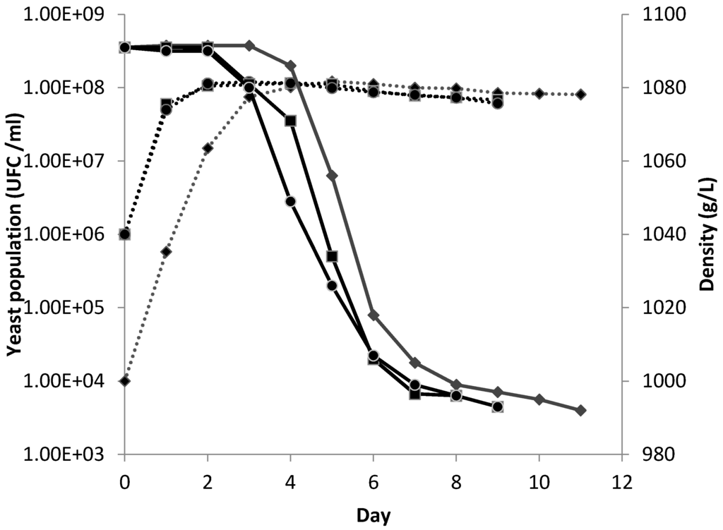 Evolution of the total yeast population (dashed lines) and must density (continuous lines) during three wine fermentations performed with Malvar musts using the following inoculation procedures: no inoculation (♦); inoculation with yeast strain CLI 889 (■); and inoculation with yeast strain CLI 892 (●). Data correspond to mean values obtained from triplicate experiments.