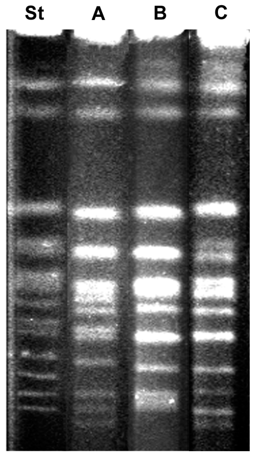 Electrophoretic karyotypes of the majority at the end of the fermentation Saccharomyces cerevisiae yeast strain isolated from the spontaneous fermentations (A) and selected inoculated yeast strains CLI 889 (B) and CLI 892 (C) The chromosomes of the standard S cerevisiae YNN 295 (Bio-Rad) were used as a reference (St).