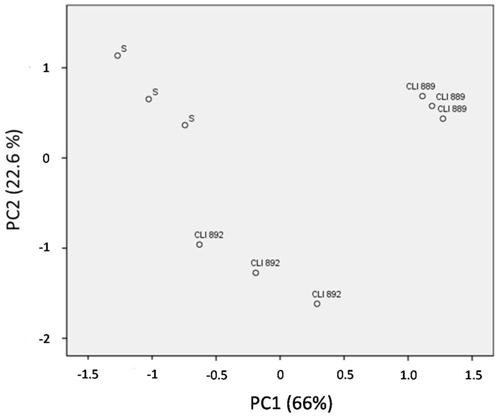 Principal components analysis of volatile composition data. Projection of the Malvar wines fermented spontaneously (S), and with CLI 892 and CLI 889 S. cerevisiae strains in the dials formed by the PC1 (22.6%) and PC2 (66%).