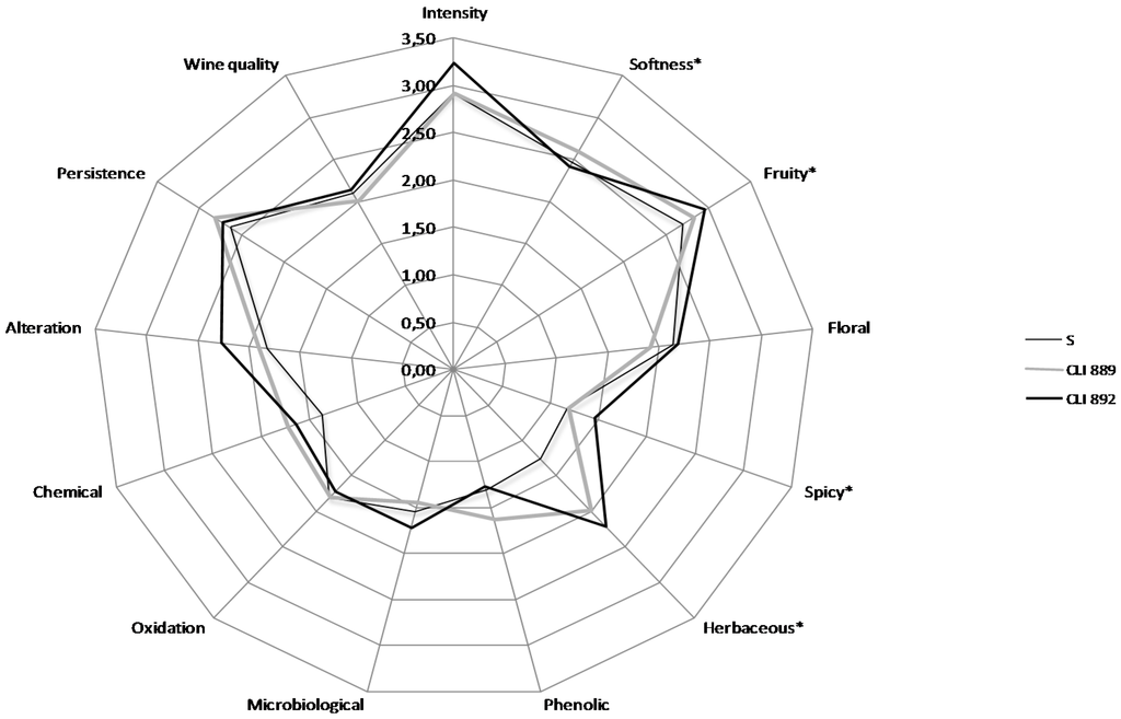 Polar coordinate (cobweb) graph of mean sensory scores rating of “alteration”, “chemical”, “herbaceous”, “intensity”, “floral”, “fruity”, “microbiological”, “oxidation”, “persistence”, “phenolic”, “softness”, “spicy”, and “wine quality” for wines made with the uninoculated S. cerevisiae (S) and locally-selected CLI 889 and CLI 892 yeast strains. In sensorial variables indicated with an asterisk (*) a difference between some trials is verified for p ≤ 0.05.