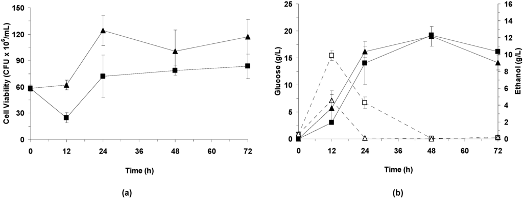 During SSF of wheat straw slurry, cell viability—in the form of CFU/mL—decreased within the first 12 h in control assays (Figure 2A). This effect is correlated with the adaptation of the yeast to the different components in the fermentation medium, and usually promotes a delay in glucose consumption and ethanol production (Figure 2B). This adaptation period depends on different factors, such as the presence of inhibitory compounds, the nature and concentration of inhibitors and the synergistic effects between them [5,36].