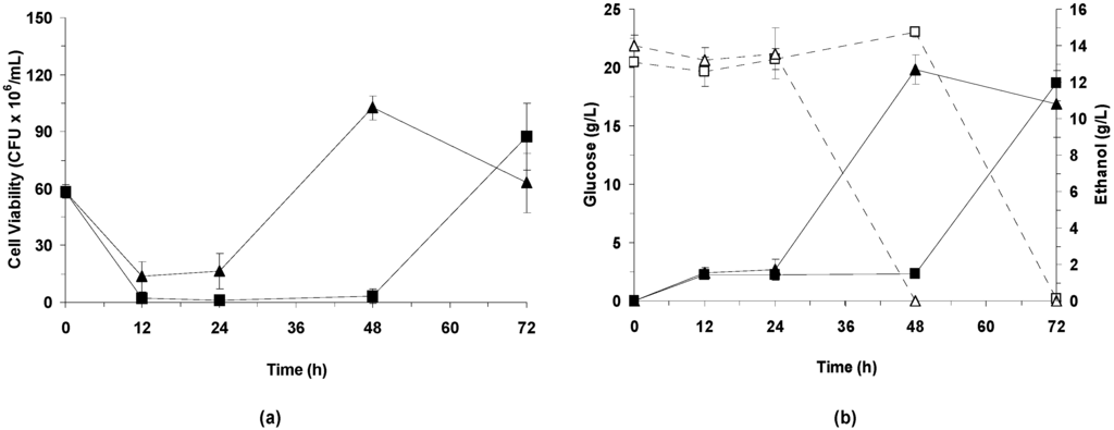 Consecutive laccase treatment and simultaneous saccharification and fermentation (LSSF, Strategy 3). (a) Viable cells during simultaneous saccharification and fermentation (SSF) assay with K. marxianus of slurry samples resulting from Metzyme laccase treatment. Symbols used: control (■) and laccase (▲) samples. (b) Time course for ethanol (filled symbols and continuous lines) and glucose (open symbols and discontinuous lines) during simultaneous saccharification and fermentation (SSF) assay with K. marxianus of slurry samples resulting from Metzyme laccase treatment. Symbols used: control (■, □) and laccase (▲, △) samples. Mean values and standard deviations were calculated from the triplicates to present the results.