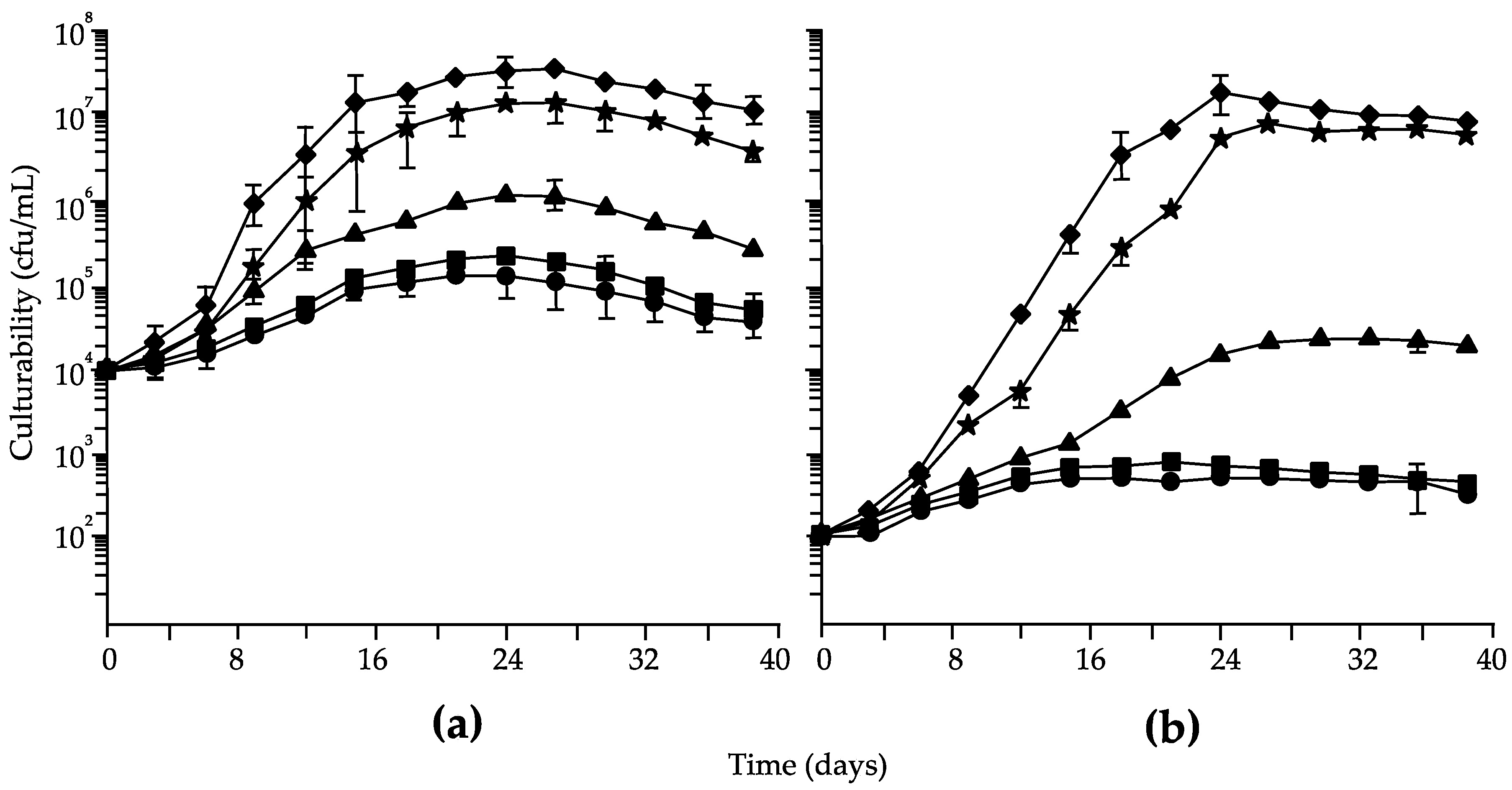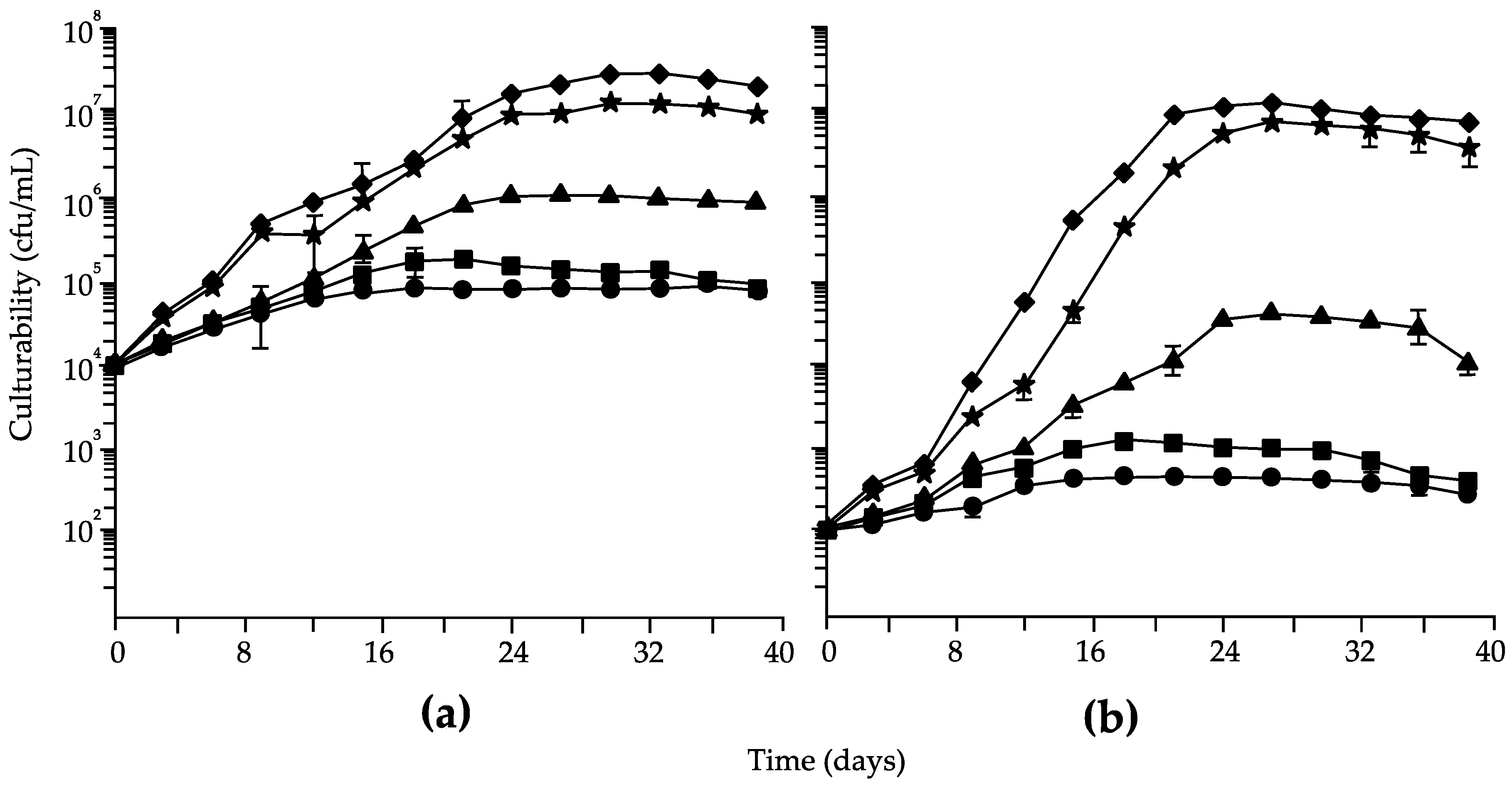 Culturabilities of Brettanomyces bruxellensis strains I1a inoculated at (a) 104 or (b) 102 cfu/mL in media containing 0 (★), 0.002 (●), 0.02 (▲), 0.2 (■), or 2 (♦) µg/L biotin.