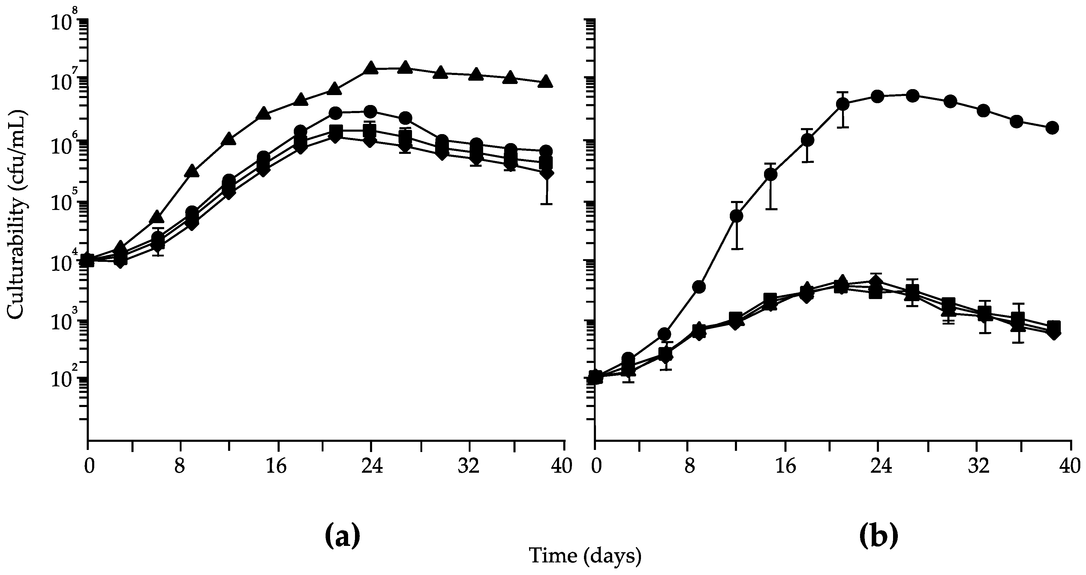 Culturabilities of Brettanomyces bruxellensis strains I1a inoculated at (a) 104 or (b) 102 cfu/mL in wines with no additions (♦), with egg whites for 24 (▲) or 336 h (■), or with avidin suspended in dialysis tubing for 24 h (●).