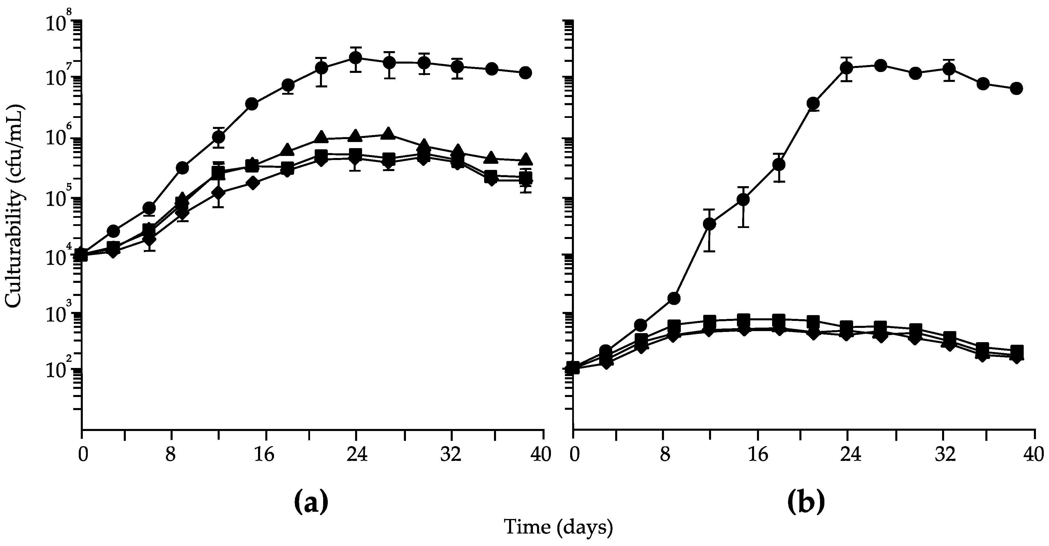 Culturabilities of Brettanomyces bruxellensis strains 2091 inoculated at (a) 104 or (b) 102 cfu/mL in wines with no additions (♦), with egg whites for 24 (▲) or 336 h (■), or with avidin suspended in dialysis tubing for 24 h (●).