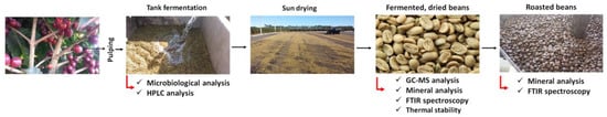 Mineral analysis was performed of fermented, dried and roasted coffee beans (Figure 1). The fermented, dried coffee samples were roasted in a semi-industrial roaster (Probatino, Leogap model, Brazil) at 140 °C for 30 min. For sample preparation, fermented and roasted cocoa samples were transferred to a 250 mL volumetric flask and acidified with 5 mL of concentrated P.A. HNO3 and H2O2 30%. Subsequently, the system was allowed to heating for 40 min at 80 °C. The extract was filtered by a 0.45 µm pore size filter and the volume was completed to 100 mL. Reference solutions were prepared using deionized water with resistivity of 18.2 MΩ·cm−1 through a Milli-Q water purification system linked to a water distillatory Fisatom (Model 534, Brazil). Glassware used in this procedure was subjected to a decontamination treatment with HNO3 10% (w/v) for 24 h prior to use.