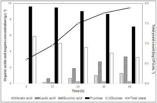 The yeast growth was accompanied by a regular consumption of pulp sugars (glucose and fructose) and their conversion into organic acids. Lactic acid was the major metabolite produced, reaching a concentration of 3.28 g·L−1 at 48 h, followed by acetic and succinic acids (1.27 and 0.30 g·L−1, respectively). The low production of acetic acid (<1.5 g·L−1) and the absence of butyric and propionic acids minimize the formation of off-flavors in the final beverage [15,16]. On the other hand, lactic acid production can assist in the coffee-pulp acidification process without interfering in the final product quality [6]. Such organic acids production during coffee fermentation is mainly associated with lactic acid bacteria metabolism [5]. However, yeasts of the genera Saccharomyces, Pichia and Hanseniaspora may also have produced a fraction of the concentration of organic acids found in the coffee pulp beans mass in this study [17,18,19].