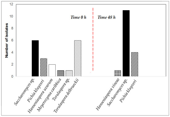 Descriptions of the load of yeast in coffee fermentation have been provided by some studies [9,10,13,14]. This has been reported to range between 2 to 7 log CFU·mL−1, depending on the study. Factors affecting the initial yeast load include the quality and integrity of the coffee beans and the hygiene of fermentation tank, utensils and water used at the commencement of the fermentation process [6]. In this study, the average number of yeast, which was 6.60 log CFU·mL−1 early in the fermentation process, increased to 7.89 log CFU·mL−1 by the end of 48 h of fermentation (Figure 2). This growth is favored by the ability of yeast cells to metabolize coffee pulp sugars as well to adapt and to cope with the hostile environment and stress conditions prevailing in coffee fermentation matrix [1].
