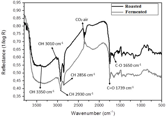 Over the last two decades, vibrational spectroscopy methods have proven to be a reliable and fast technique for the identification and quantification of several primary and secondary metabolites generated during fermentation processes or to estimate the quality of the food itself [28,29,30,31,32]. In this study, FTIR spectroscopy analysis showed a quite similar spectrum for both fermented, dried and roasted coffee beans (Figure 4). It was possible to verify the presence of the main organic functions associated with the coffee aroma, such as aromatic acids (1700–1680 cm−1), ketones (1725–1705 cm−1), aldehydes (1739–1724 cm−1) and aliphatic esters (1755–1740 cm−1). Those results corroborate the wide variety of volatile organic compounds identified by the SPME-GC-MS technique (Table 1).