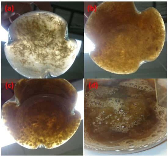 Biomass morphologies obtained when growing R. oryzae in Erlenmeyer flasks using different PPL–water ratios: (a) 1:39; (b) 1:19; (c) 1:9 and; (d) 1:4.