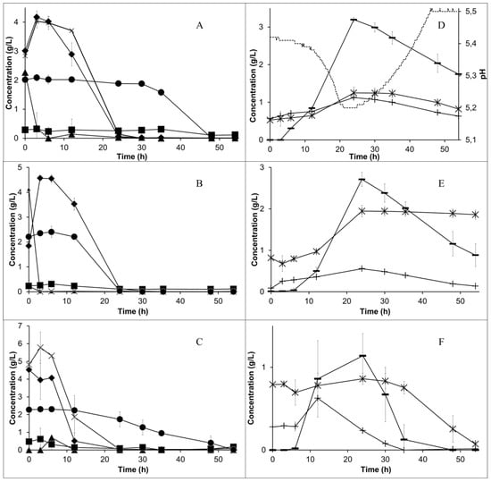 Cultivation of R. oryzae in 1:9 water–diluted PPL in airlift bioreactors: concentration profiles of glucose (♦); sucrose (▲); fructose (×); ammonia (■); asparagine (●); ethanol (-); lactic acid (Ж); and glycerol (+) at different aeration rates: (A,D) 0.57 vvm; (B,E) 0.86 vvm; (C,F) 1.14 vvm. pH profile shown for the first case (D) in the dashed line.