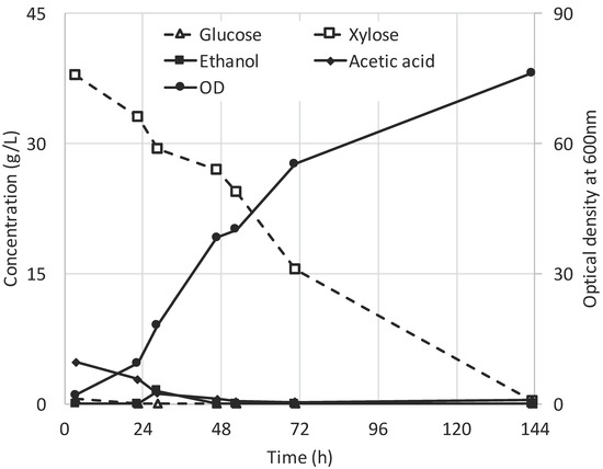 The time-course of the fermentation of the SSL permeate with xylose-metabolizing Saccharomyces cerevisiae GSE16 strain is shown in Figure 1. The culture was able to use all xylose and the residual glucose present in the medium. The residual amounts of galactose, arabinose and mannose were also consumed (data not shown). Additionally, all acetate was also consumed in the first 48 h of fermentation. A slight accumulation of ethanol was detected after 28 h of fermentation, during the stage of maximum growth rate, but all ethanol was consumed afterwards. A very small peak of glycerol was detected, but at concentrations close to or below detection level. The fermentation samples were also analyzed for dicarboxylic acids, such as citric, succinic, fumaric and malic acids, but none were detected. Only traces of pyruvate were observed, but again at concentrations close to or below detection level.