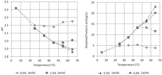 Variation of pH of different fumaric acid (FA) solutions with varying temperature (left) and equivalent calculated dissolved FA concentration (right).