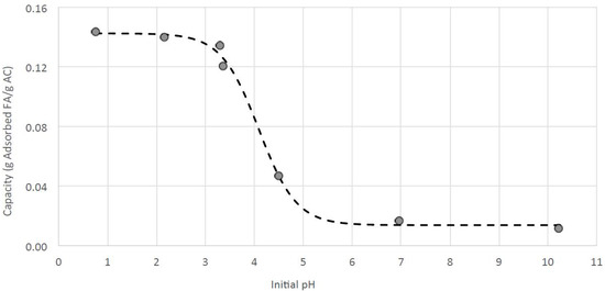 Since an 89.6% purity is still below specification and the visual inspection clearly showed contamination of the product by compounds from the initial raw material, treatment of the obtained product with activated carbon (AC) was envisaged. AC is a known adsorbent commonly applied in industry, and has been already tested in the purification of FA from fermentation broth using a defined culture medium [18]. The effects of temperature, contact time and pH on the adsorption capacity of FA were tested. It was found that contact time and temperature do not influence the adsorption capacity of AC (data not shown). However, by varying the pH, the capacity of AC to adsorb FA varied markedly (Figure 3).