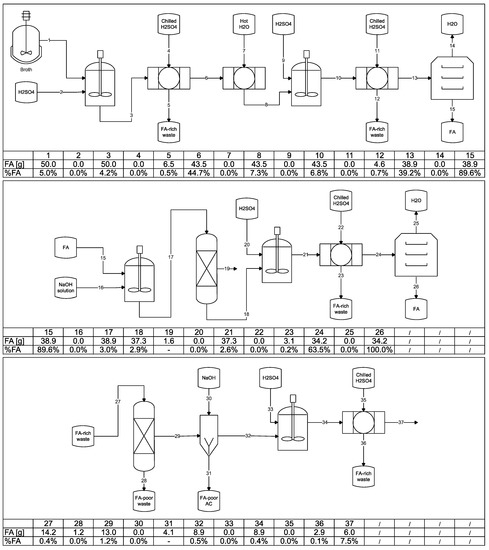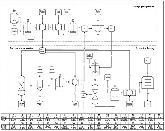 The FA purification process from the fermented SSL-based medium is then effectively achieved by performing a two-stage precipitation process, polishing the thus obtained FA by removing most of the contaminants through AC adsorption under basic conditions and increasing the overall yield by capturing residual FA from liquid waste streams also by AC under acidic conditions. Figure 5 shows a process flow diagram of these operations together with the FA mass balance and concentration in each stream (w/w). By analyzing the processes, a number of optimization opportunities become evident: (i) The FA-rich stream 13 can be sent directly to the polishing step with AC under basic conditions without requiring the energy-consuming drying step; (ii) Stream 37, a slurry with the FA recovered from the chilled washes of FA-rich precipitates (see Section 3.5), contains only about 7.5% of FA, which will not meet purity targets and is too diluted to be dried, but it has a very similar composition to the acidic solution of stream 10. It was thus decided to redirect stream 37 back to the two-stage precipitation process by mixing with stream 10, thus subjecting the contents of stream 37 to a second wash step. Another possibility would be to mix stream 34 with stream 10, since both are acidic solutions generated upon the addition of H2SO4, but this would yield a significant dilution of stream 10, thus affecting the efficiency of the subsequent filtration and wash step and hence such possibility was ruled out; (iii) Stream 36 also generates a waste stream containing FA, which actually corresponds to 20.3% of the FA that is to be recovered from the chilled wash of FA-rich precipitates in the process described in Section 3.5. This stream can also be recovered and recycled back to the activated carbon treatment under acidic conditions.