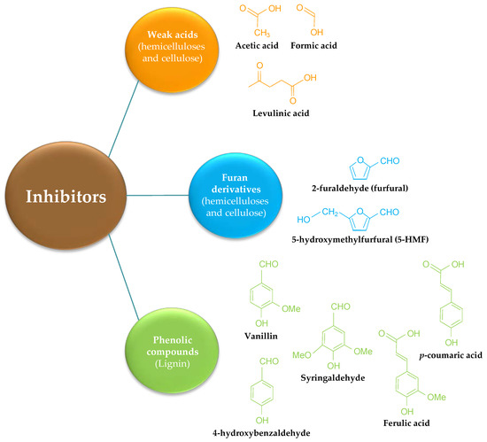 Pretreatment of lignocellulose often involves side reactions resulting in the release of certain biomass-derived by-products that are inhibitors of downstream biochemical processes [5]. They mainly include furan derivatives, aliphatic acids, and phenolic and other aromatic compounds (Figure 1). Extractives (mainly terpenes, fats, waxes, and phenolics) and inorganic compounds may also promote inhibition of enzymes and microorganisms in the subsequent steps [1]. The nature and concentration of all these inhibitory products is strongly dependent on the feedstock as well as the pretreatment process [23].