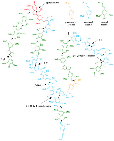 Schematic representation of lignin structure showing the main interunit linkages originated from p-coumaryl, coniferyl, and sinapyl alcohols.