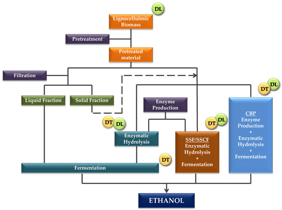 Schematic representation of lignocellulosic ethanol production showing (1) the different process configurations, and (2) the points where laccase delignification (DL) and laccase detoxification (DT) can be applied. The scheme can also be extended to the generation of several fermentation-based products including different alcohols, lipids, alkenes and other chemicals. SSF, simultaneous saccharification and fermentation; SSCF, simultaneous saccharification and co-fermentation; CBP, consolidated bioprocessing. Dashed line arrow represents the flow of the solid fraction after a water washing step.