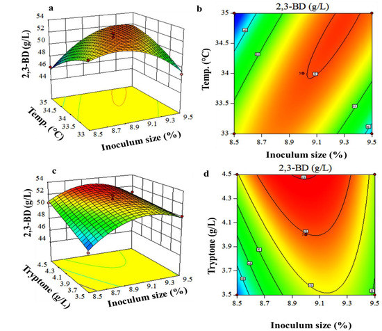 Contour and response surface plots. (a) The response surface plot; (b) the resultant contour plot showing the effects of temperature and inoculum size on 2,3-BD production by P. polymyxa with tryptone fixed at 4 g/L; (c) response surface plot and (d) the resultant contour plot depicting the effects of tryptone and inoculum size on 2,3-BD production by P. polymyxa with the temperature fixed at 34 °C.