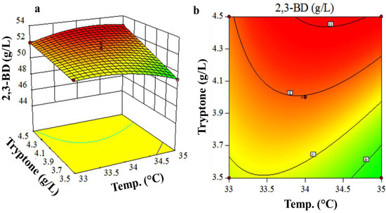Contour and response surface plots. (a) The response surface plot and (b) the resultant contour plot (b) showing the effects of tryptone and temperature on 2,3-BD production by P. polymyxa with the inoculum size fixed at 9%.