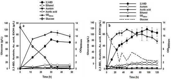 - Kim, T.; Cho, S.; Woo, H.M.; Lee, S.M.; Lee, J.; Um, Y.; Seo, J.H. High production of 2,3-butanediol from glycerol without 1,3-propanediol formation by Raoultella ornithinolytica B6. Appl. Microbiol. Biotechnol. 2017, 101, 2821–2830. [Google Scholar] [CrossRef] [PubMed]