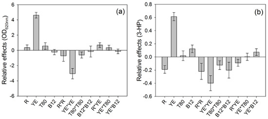 The contributions of each parameter on both responses were different (Figure 1). The highest contribution to both responses was due to the concentration of yeast extract, which impacts positively both the final ∆OD and the 3-HP production.