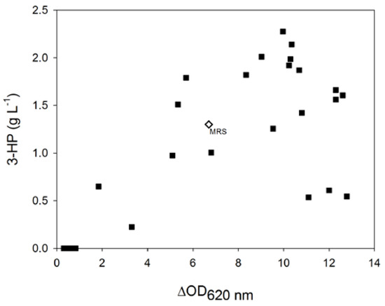 In parallel, three control fermentations were conducted in MRS under the same conditions. The average ∆OD obtained was 6.7 ± 0.8 and the 3-HP production at the end of the bioconversion phase was 1.3 ± 0.1 g·L−1.
