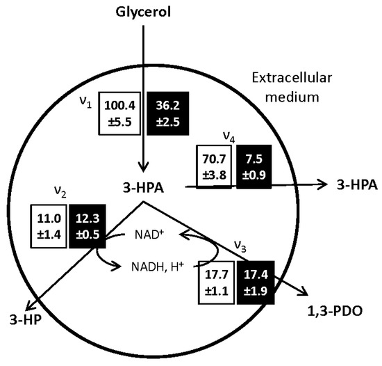 The metabolic fluxes through the different pathways, presented in Figure 4, were calculated at the onset of the bioconversion phase and are representative of the glycerol dehydratase (GDH) activity of the bacterial population [27].