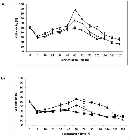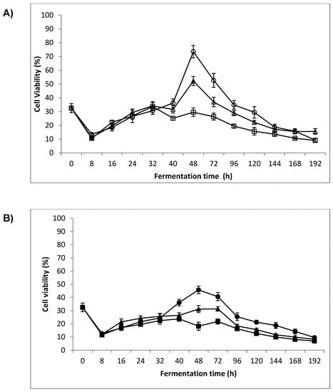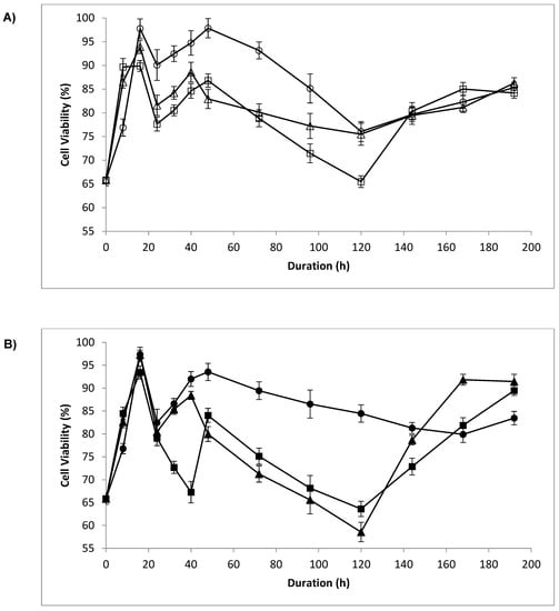 (A) Yeast cell viability (%) of non-NaCl-stressed cells during various fermentation times (h) with three different media containing 200, 300, or 400 g/L glucose after cell treatment with sonication (n = 3 replications for each time and error bars represent standard deviation of the average value of all replications with each range of fermentation time); (B) Yeast cell viability (%) of NaCl-stressed cells during various fermentation times (h) with three different media containing 200, 300, or 400 g/L glucose after cell treatment with sonication (n = 3 replications for each time and error bars represent standard deviation of the average value of all replications with each range of fermentation time) (○): (200 g/L glucose, 0% NaCl), (∆): (300 g/L glucose, 0% NaCl), (□): (400 g/L glucose, 0% NaCl), (●): (200 g/L glucose, 6% NaCl), (∆): (300 g/L glucose, 6% NaCl), (■): (400 g/L glucose, 6% NaCl).