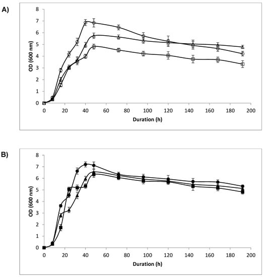 (A) OD (600 nm) of non-NaCl-stressed cells during various fermentation times (h) with three different media containing 200, 300, or 400 g/L glucose (n = 3 replications for each time); (B) OD (600 nm) of NaCl-stressed cells during the fermentation process (h) with three different media containing 200, 300,or 400 g/L glucose (n = 3 replications for each time) (○): (200 g/L glucose, 0% NaCl), (∆): (300 g/L glucose, 0% NaCl), (□): (400 g/L glucose, 0% NaCl), (●): (200 g/L glucose, 6% NaCl), (▲): (300 g/L glucose, 6% NaCl), (■): (400 g/L glucose, 6% NaCl).